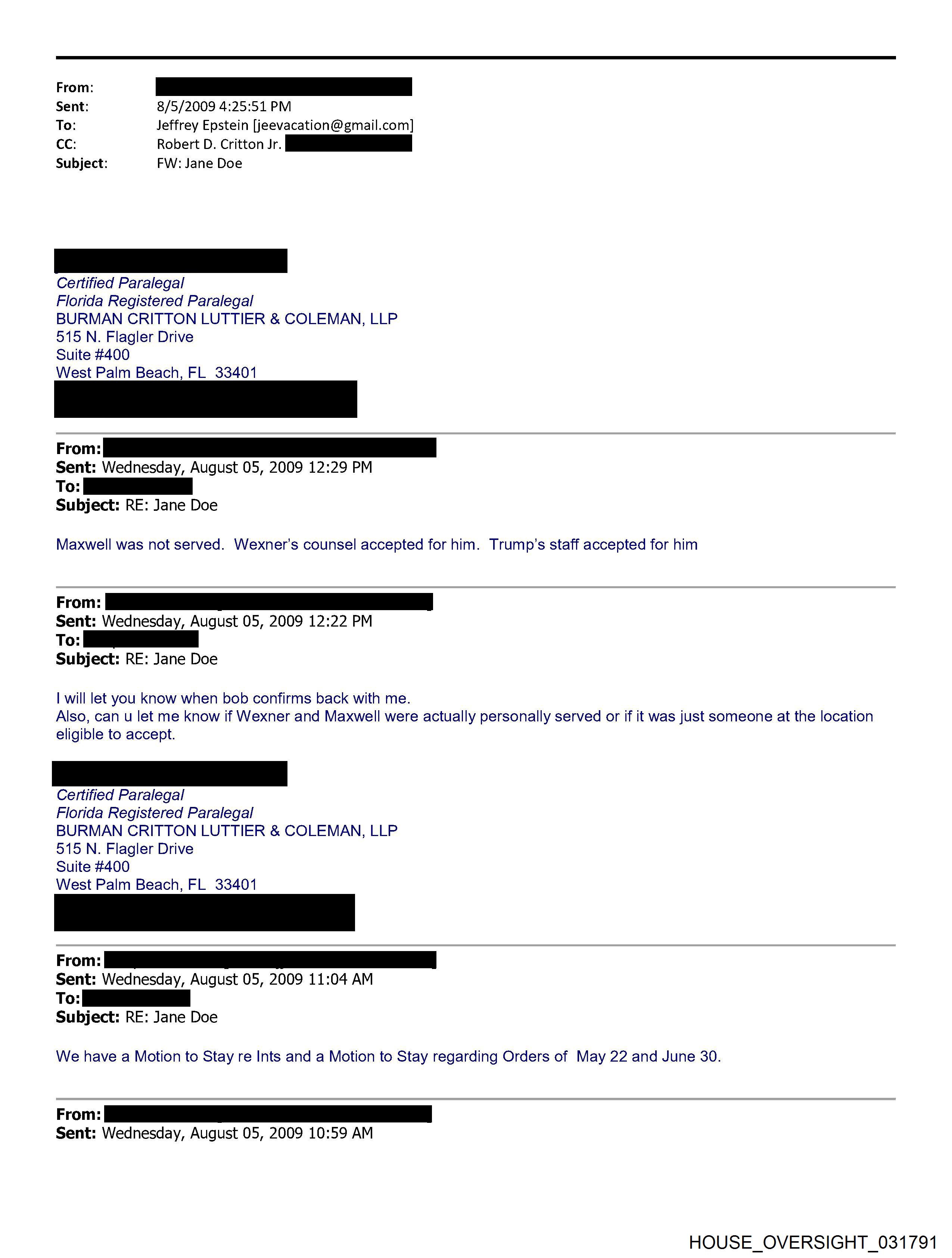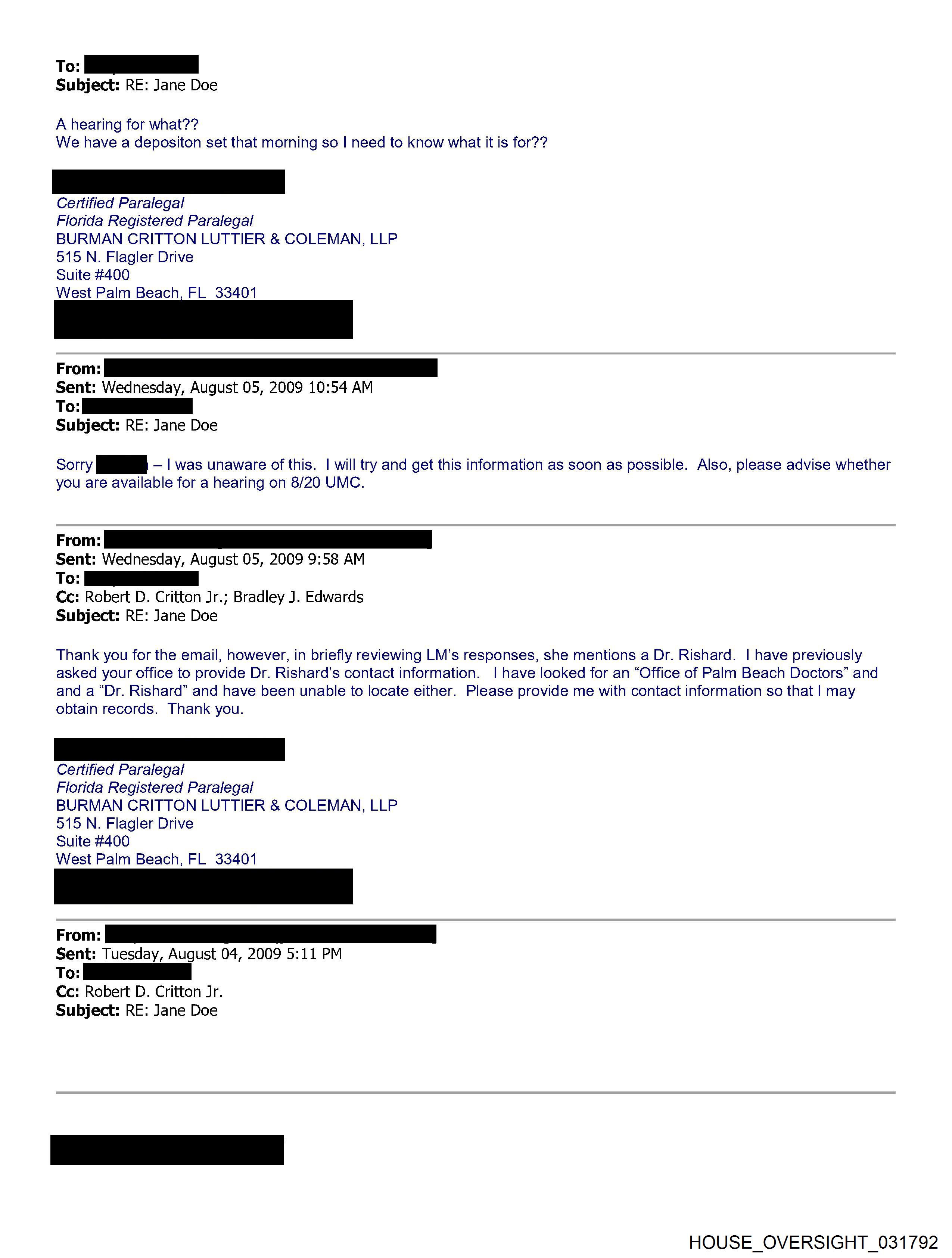 From: [REDACTED] Sent: Tuesday, August 04, 2009 5:11 PM To: [REDACTED] Cc: Robert D. Critton Jr. Subject: RE: Jane Doe [BLANK] From: [REDACTED] Sent: Wednesday, August 05, 2009 9:58 AM To: [REDACTED] Cc: Robert D. Critton Jr.; Bradley J. Edwards Subject: RE: Jane Doe Thank you for the email, however, in briefly reviewing LM's responses, she mentions a Dr. Rishard. I have previously asked your office to provide Dr. Rishard's contact information. I have looked for an "Office of Palm Beach Doctors" and and a "Dr. Rishard" and have been unable to locate either. Please provide me with contact information so that I may obtain records. Thank you. [REDACTED] Certified Paralegal Florida Registered Paralegal BURMAN CRITTON LUTTIER & COLEMAN, LLP 515 N. Flagler Drive Suite #400 West Palm Beach, FL 33401 [REDACTED] From: [REDACTED] Sent: Wednesday, August 05, 2009 10:54 AM To: [REDACTED] Subject: RE: Jane Doe Sorry [REDACTED] I was unaware of this. I will try and get this information as soon as possible. Also, please advise whether you are available for a hearing on 8/20 UMC. From: [REDACTED] Sent: Wednesday, August 05, 2009 10:59 AM To: [REDACTED] Subject: RE: Jane Doe A hearing for what?? We have a depositon set that morning so I need to know what it is for?? [REDACTED] Certified Paralegal Florida Registered Paralegal BURMAN CRITTON LUTTIER & COLEMAN, LLP 515 N. Flagler Drive Suite #400 West Palm Beach, FL 33401 [REDACTED] From: [REDACTED] Sent: Wednesday, August 05, 2009 11:04 AM To: [REDACTED] Subject: RE: Jane Doe We have a Motion to Stay re Ints and a Motion to Stay regarding Orders of May 22 and June 30. From: [REDACTED] Sent: Wednesday, August 05, 2009 12:22 PM To: [REDACTED] Subject: RE: Jane Doe I will let you know when bob confirms back with me. Also, can u let me know if Wexner and Maxwell were actually personally served or if it was just someone at the location eligible to accept. [REDACTED] Certified Paralegal Florida Registered Paralegal BURMAN CRITTON LUTTIER & COLEMAN, LLP 515 N. Flagler Drive Suite #400 West Palm Beach, FL 33401 [REDACTED] From: [REDACTED] Sent: Wednesday, August 05, 2009 12:29 PM To: [REDACTED] Subject: RE: Jane Doe Maxwell was not served. Wexner's counsel accepted for him. Trump's staff accepted for him From: [REDACTED] Sent: 8/5/2009 4:25:51 PM To: Jeffrey Epstein [jeeyacation@gmail.com] CC: Robert D. Critton Jr. Subject: FW: Jane Doe [REDACTED] Certified Paralegal Florida Registered Paralegal BURMAN CRITTON LUTTIER & COLEMAN, LLP 515 N. Flagler Drive Suite #400 West Palm Beach, FL 33401 [REDACTED] [BLANK] HOUSE OVERSIGHT 031791 HOUSE OVERSIGHT 031792