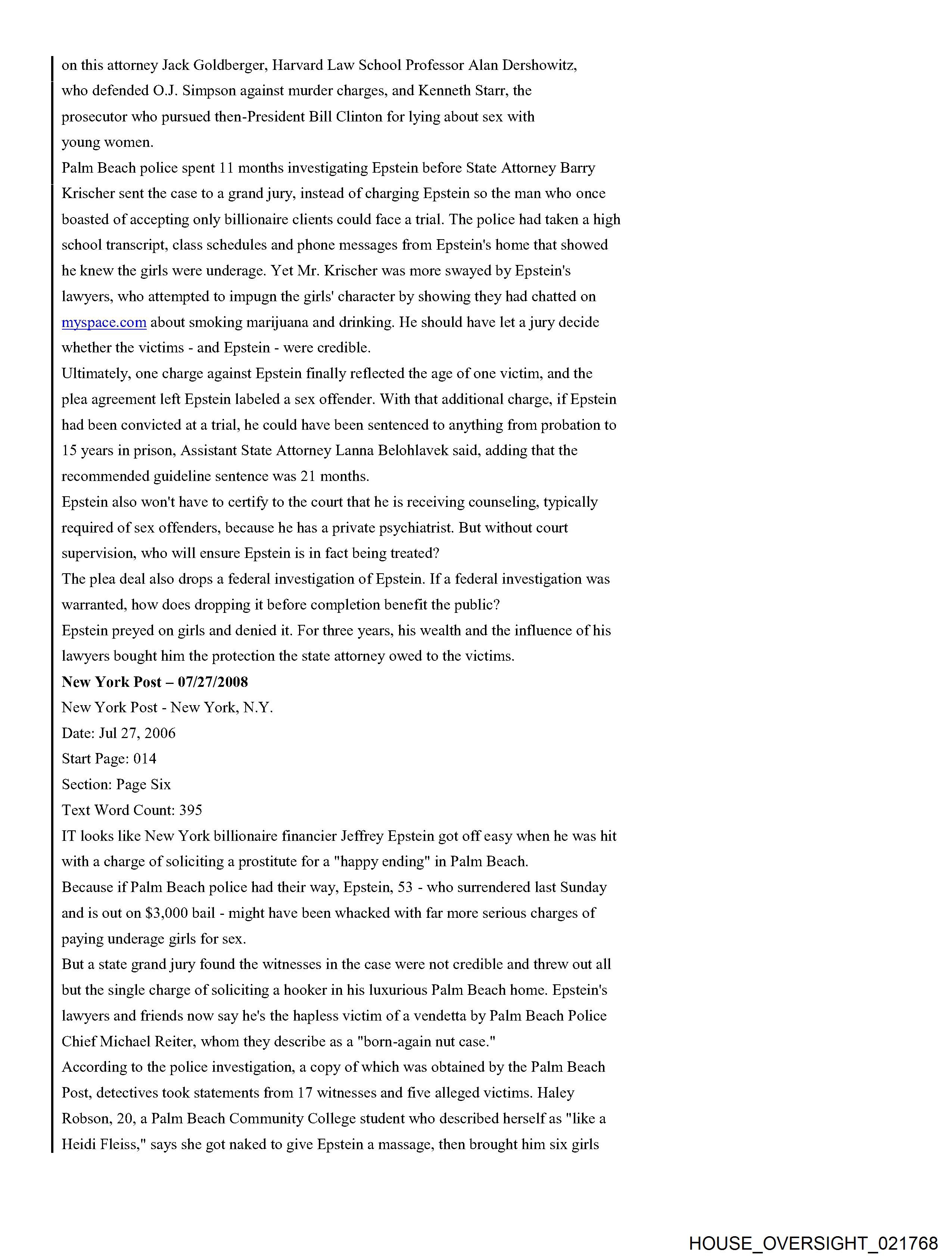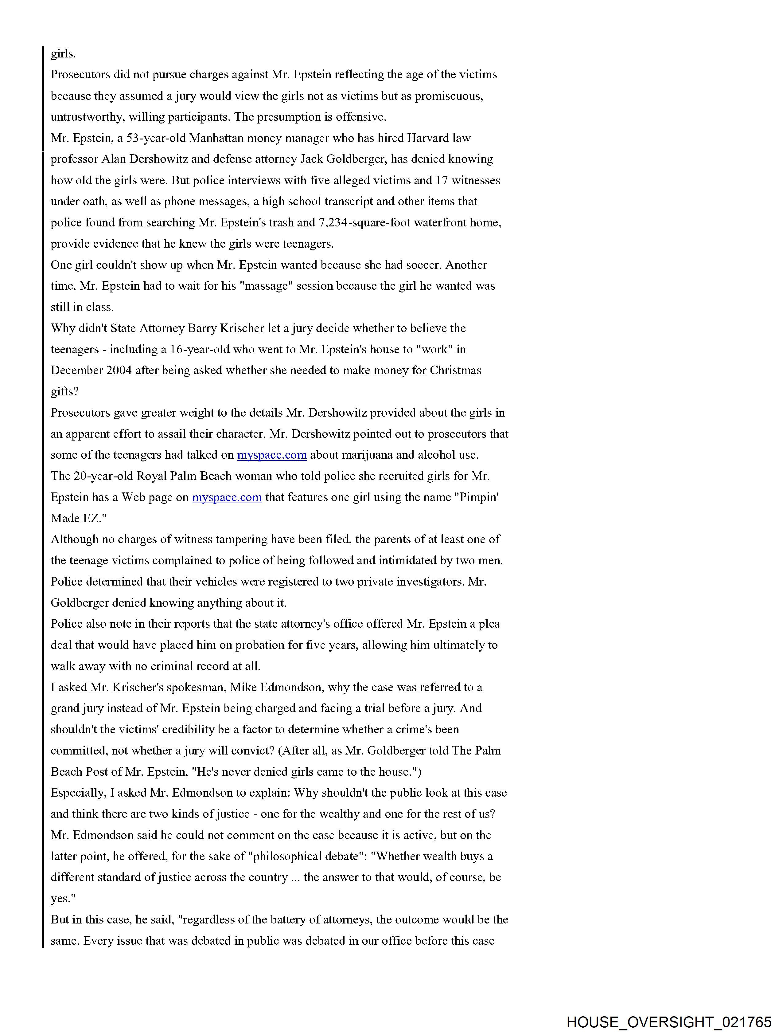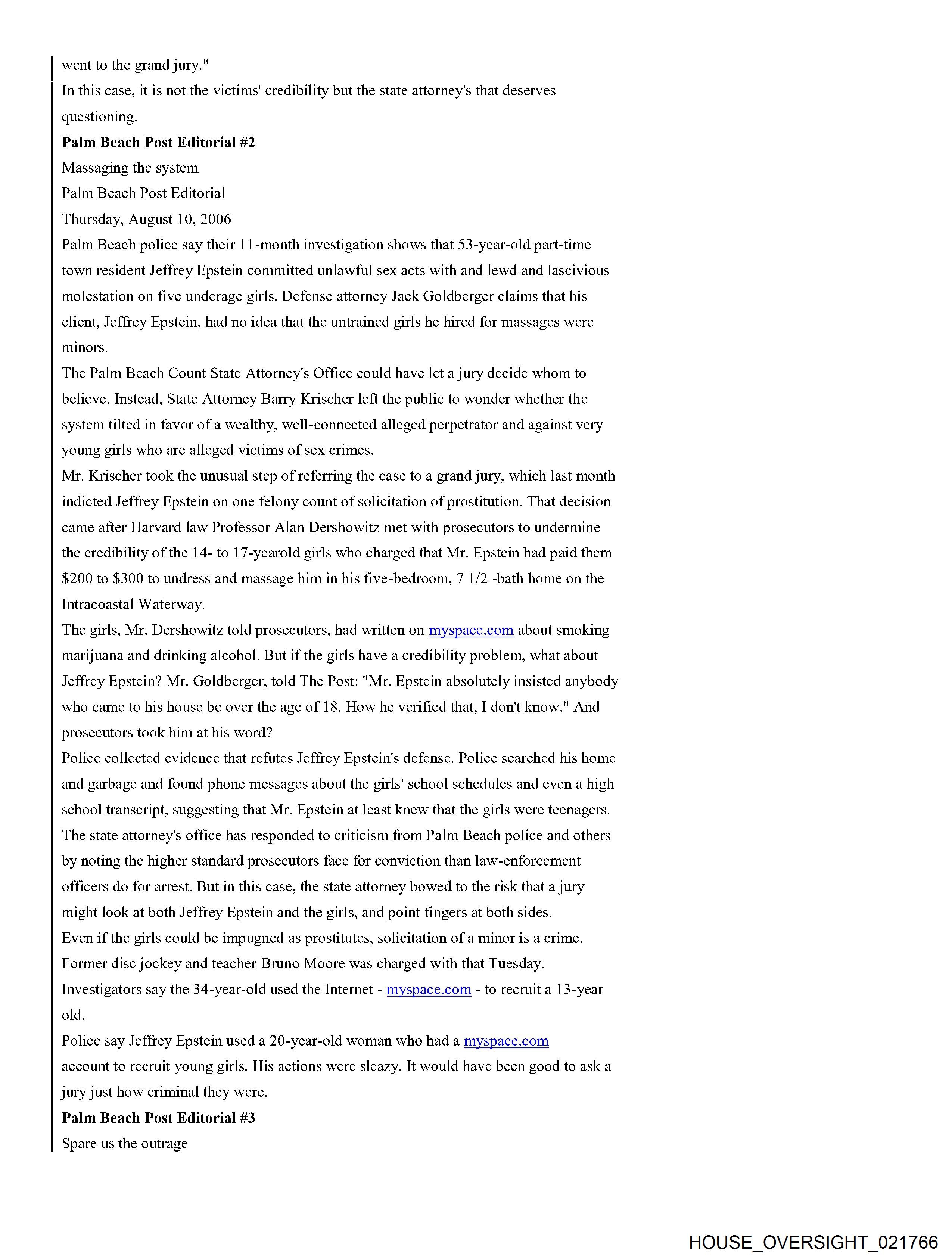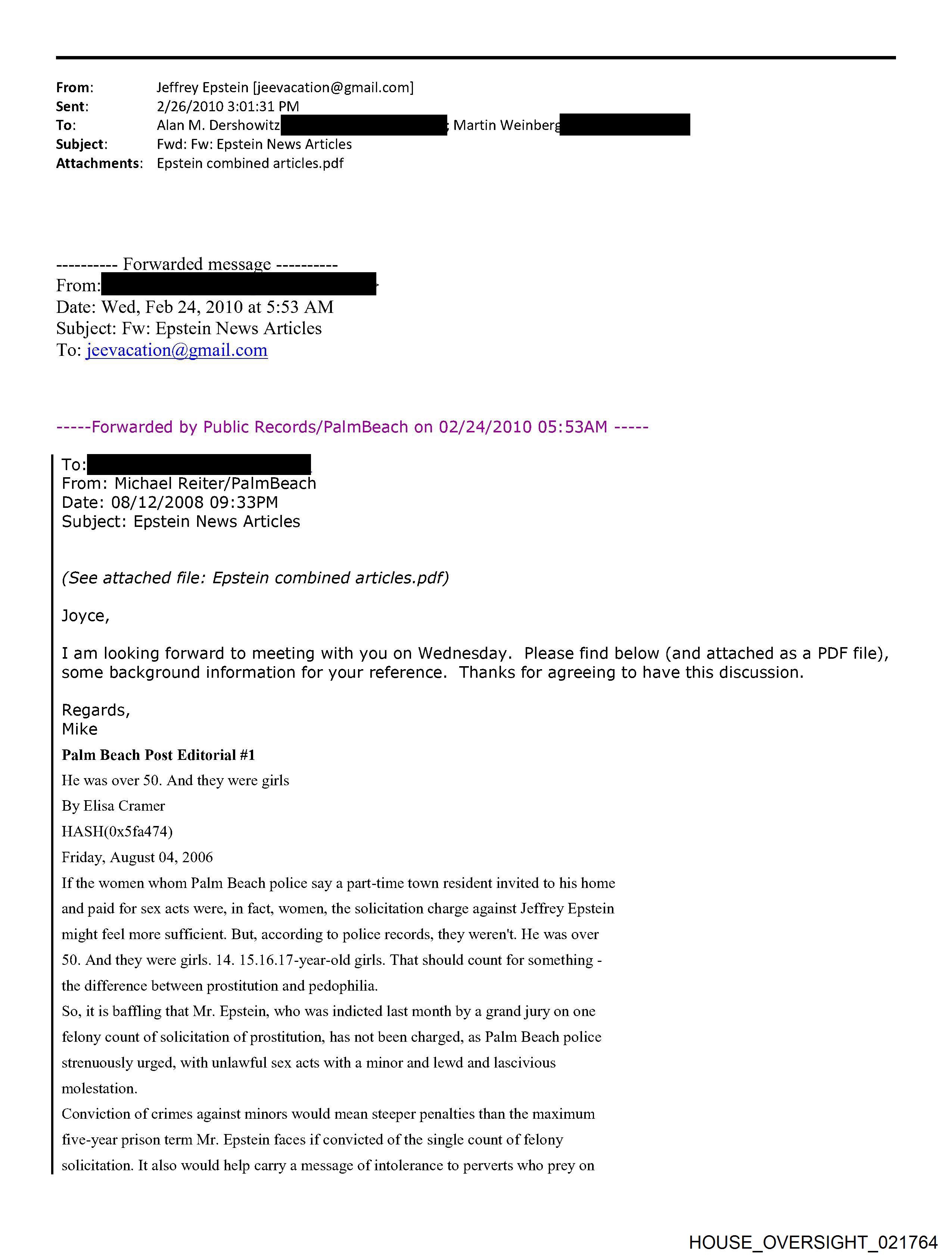 From: Jeffrey Epstein [jeevacation@gmail.com] Sent: 2/26/2010 3:01:31 PM To: Alan M. Dershowitz [REDACTED]; Martin Weinberg [REDACTED] Subject: Fwd: Fw: Epstein News Articles Attachments: Epstein combined articles.pdf Forwarded message From: [REDACTED] Date: Wed, Feb 24, 2010 at 5:53 AM Subject: Fw: Epstein News Articles To: jeevacation@gmail.com -----Forwarded by Public Records/PalmBeach on 02/24/2010 05:53AM ----- To: [REDACTED] From: Michael Reiter/PalmBeach Date: 08/12/2008 09:33PM Subject: Epstein News Articles (See attached file: Epstein combined articles.pdf) Joyce, I am looking forward to meeting with you on Wednesday. Please find below (and attached as a PDF file), some background information for your reference. Thanks for agreeing to have this discussion. Regards, Mike Palm Beach Post Editorial #1 He was over 50. And they were girls By Elisa Cramer HASH(Ox5fa474) Friday, August 04, 2006 If the women whom Palm Beach police say a part-time town resident invited to his home and paid for sex acts were, in fact, women, the solicitation charge against Jeffrey Epstein might feel more sufficient. But, according to police records, they weren't. He was over 50. And they were girls. 14. 15.16.17-year-old girls. That should count for something - the difference between prostitution and pedophilia. So, it is baffling that Mr. Epstein, who was indicted last month by a grand jury on one felony count of solicitation of prostitution, has not been charged, as Palm Beach police strenuously urged, with unlawful sex acts with a minor and lewd and lascivious molestation. Conviction of crimes against minors would mean steeper penalties than the maximum five-year prison term Mr. Epstein faces if convicted of the single count of felony solicitation. It also would help carry a message of intolerance to perverts who prey on girls. Prosecutors did not pursue charges against Mr. Epstein reflecting the age of the victims because they assumed a jury would view the girls not as victims but as promiscuous, untrustworthy, willing participants. The presumption is offensive. Mr. Epstein, a 53-year-old Manhattan money manager who has hired Harvard law professor Alan Dershowitz and defense attorney Jack Goldberger, has denied knowing how old the girls were. But police interviews with five alleged victims and 17 witnesses under oath, as well as phone messages, a high school transcript and other items that police found from searching Mr. Epstein's trash and 7,234-square-foot waterfront home, provide evidence that he knew the girls were teenagers. One girl couldn't show up when Mr. Epstein wanted because she had soccer. Another time, Mr. Epstein had to wait for his "massage" session because the girl he wanted was still in class. Why didn't State Attorney Bany Krischer let a jury decide whether to believe the teenagers - including a 16-year-old who went to Mr. Epstein's house to "work" in December 2004 after being asked whether she needed to make money for Christmas gifts? Prosecutors gave greater weight to the details Mr. Dershowitz provided about the girls in an apparent effort to assail their character. Mr. Dershowitz pointed out to prosecutors that some of the teenagers had talked on myspace.com about marijuana and alcohol use. The 20-year-old Royal Palm Beach woman who told police she recruited girls for Mr. Epstein has a Web page on myspace.com that features one girl using the name "Pimpin' Made EZ." Although no charges of witness tampering have been filed, the parents of at least one of the teenage victims complained to police of being followed and intimidated by two men. Police determined that their vehicles were registered to two private investigators. Mr. Goldberger denied knowing anything about it. Police also note in their reports that the state attorneys office offered Mr. Epstein a plea deal that would have placed him on probation for five years, allowing him ultimately to walk away with no criminal record at all. I asked Mr. Krischer's spokesman, Mike Edmondson, why the case was referred to a grand jury instead of Mr. Epstein being charged and facing a trial before a jury. And shouldn't the victims credibility be a factor to determine whether a crime's been committed, not whether a jury will convict? (After all, as Mr. Goldberger told The Palm Beach Post of Mr. Epstein, "He's never denied girls came to the house.") Especially, I asked Mr. Edmondson to explain: Why shouldn't the public look at this case and think there are two kinds of justice - one for the wealthy and one for the rest of us? Mr. Edmondson said he could not comment on the case because it is active, but on the latter point, he offered, for the sake of "philosophical debate": "Whether wealth buys a different standard of justice across the country ... the answer to that would, of course, be yes." But in this case, he said, "regardless of the battery of attorneys, the outcome would be the same. Every issue that was debated in public was debated in our office before this case went to the grand jury." In this case, it is not the victims credibility but the state attorneys that deserves questioning. Palm Beach Post Editorial #2 Massaging the system Palm Beach Post Editorial Thursday, August 10, 2006 Palm Beach police say their 11-month investigation shows that 53-year-old part-time town resident Jeffrey Epstein committed unlawful sex acts with and lewd and lascivious molestation on five underage girls. Defense attorney Jack Goldberger claims that his client, Jeffrey Epstein, had no idea that the untrained girls he hired for massages were minors. The Palm Beach Count State Attorneys Office could have let a jury decide whom to believe. Instead, State Attorney Barry Krischer left the public to wonder whether the system tilted in favor of a wealthy, well-connected alleged perpetrator and against very young girls who are alleged victims of sex crimes. Mr. Krischer took the unusual step of referring the case to a grand jury, which last month indicted J