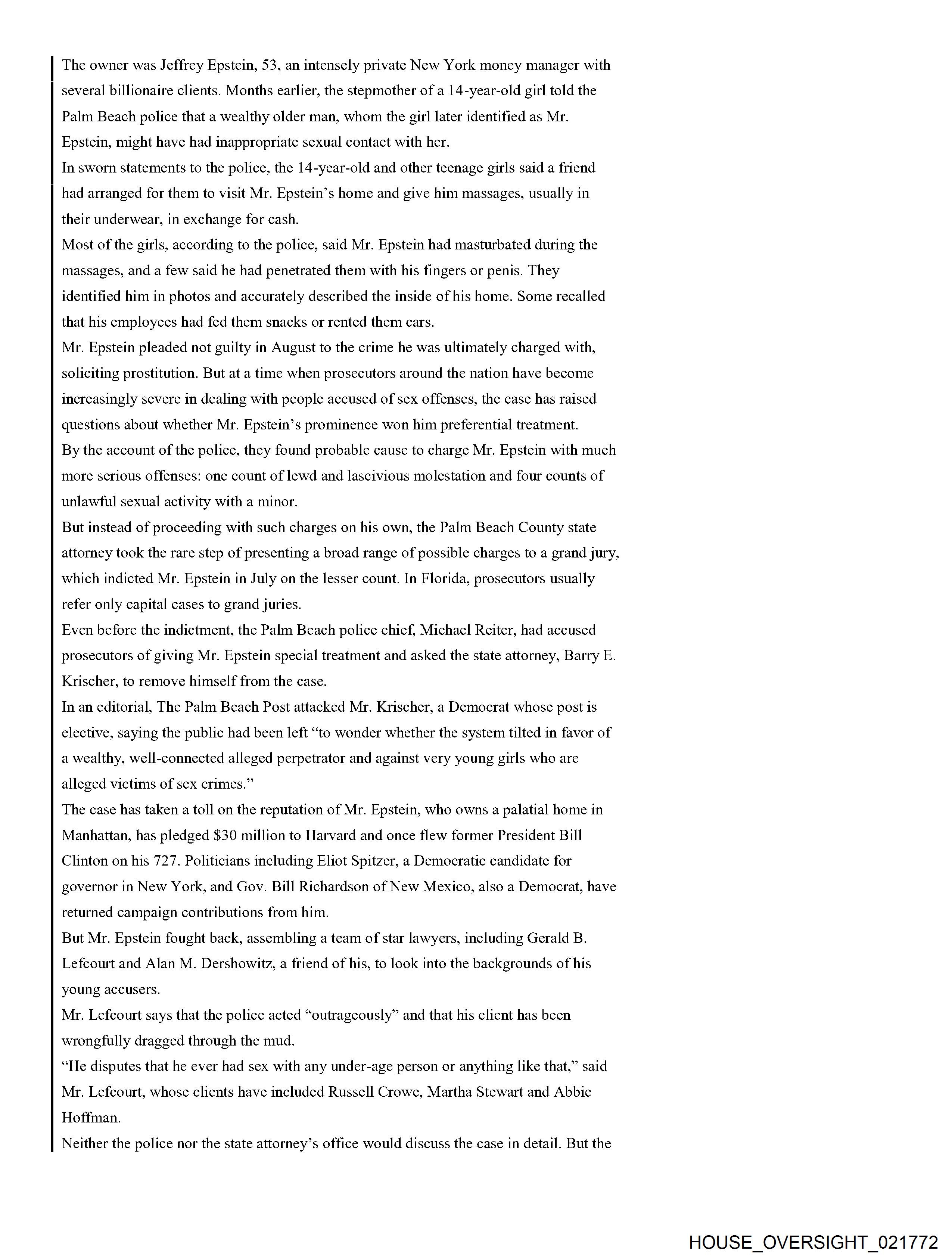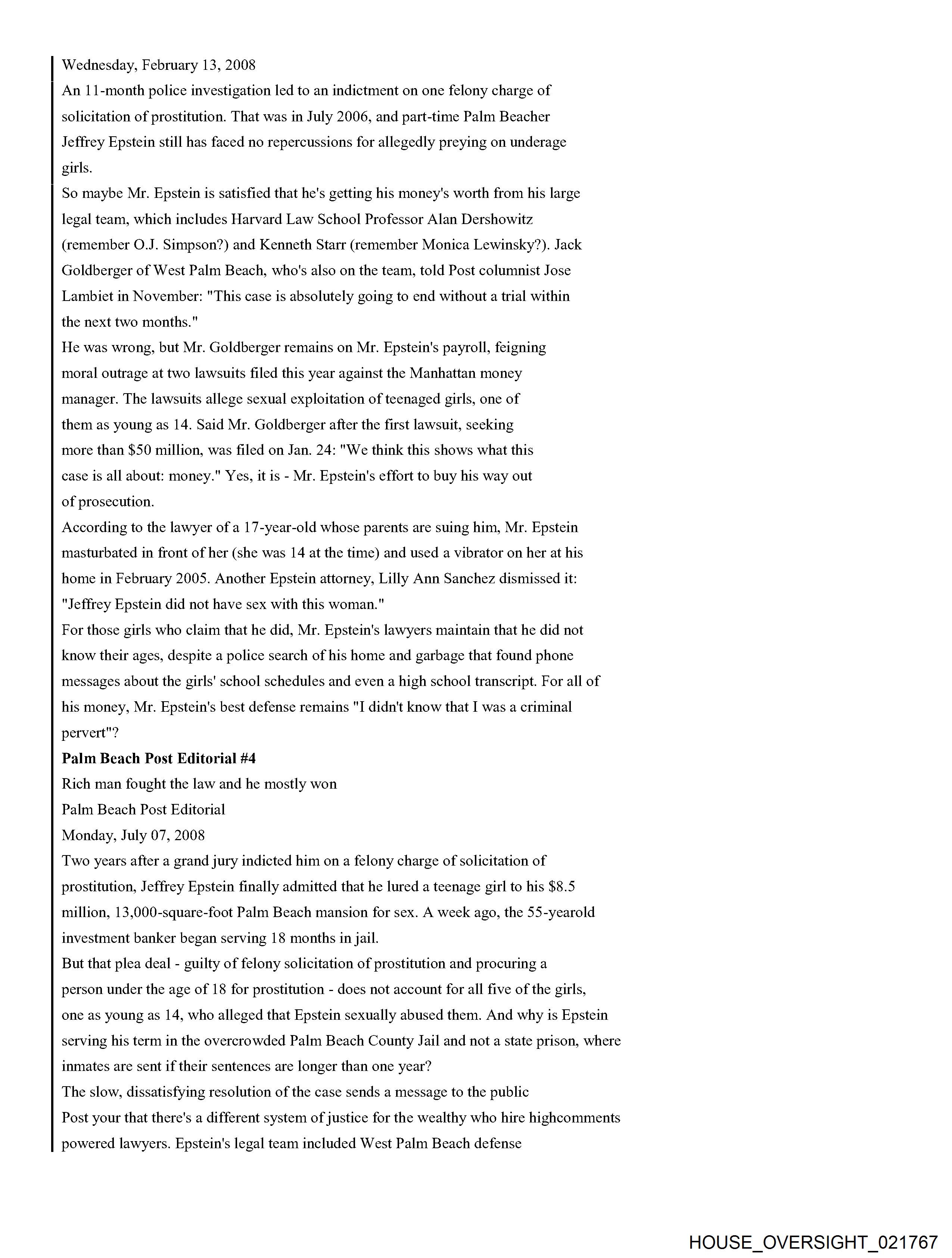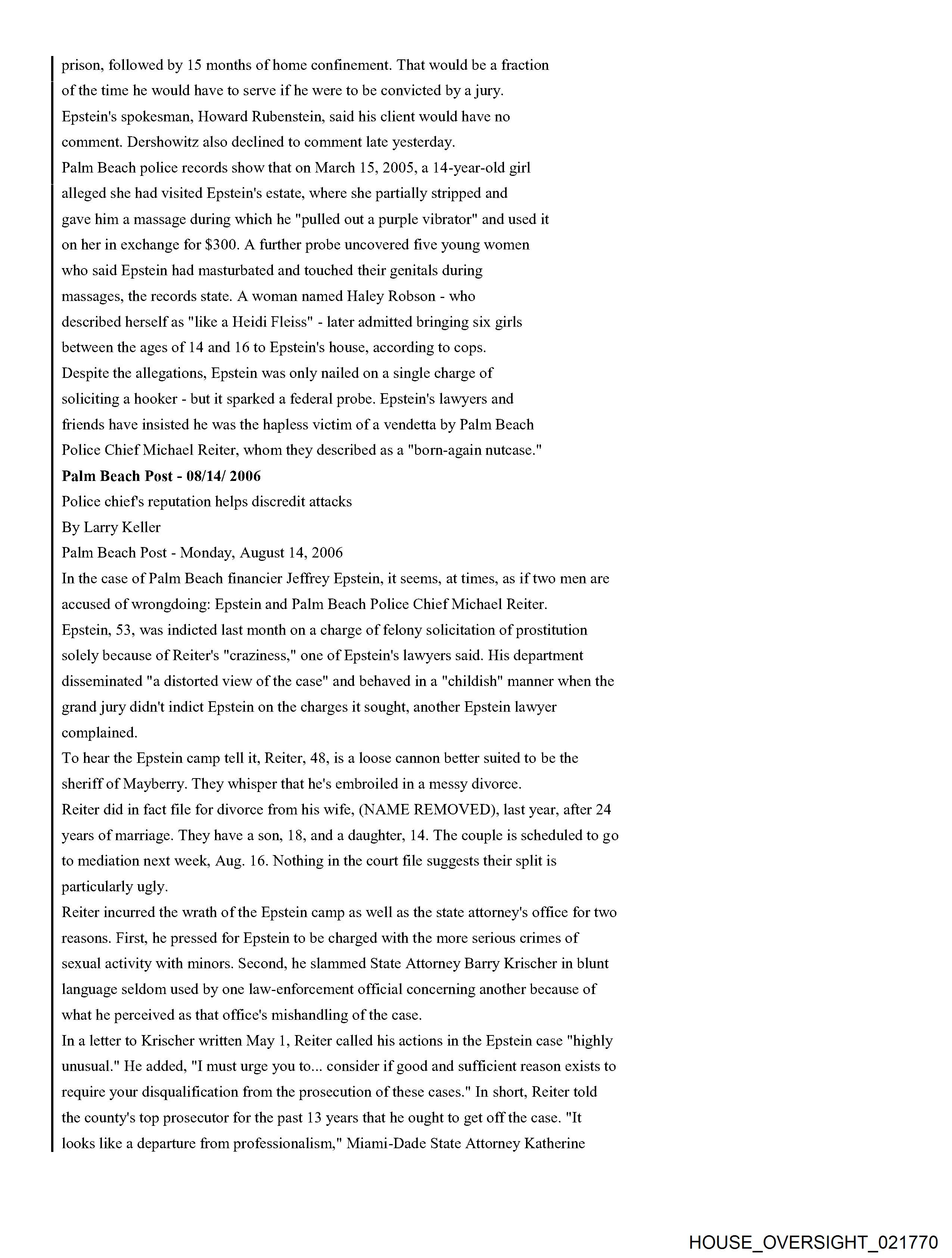 From: Jeffrey Epstein [jeevacation@gmail.com] Sent: 2/26/2010 3:01:31 PM To: Alan M. Dershowitz [REDACTED]; Martin Weinberg [REDACTED] Subject: Fwd: Fw: Epstein News Articles Attachments: Epstein combined articles.pdf Forwarded message From: [REDACTED] Date: Wed, Feb 24, 2010 at 5:53 AM Subject: Fw: Epstein News Articles To: jeevacation@gmail.com -----Forwarded by Public Records/PalmBeach on 02/24/2010 05:53AM ----- To: [REDACTED] From: Michael Reiter/PalmBeach Date: 08/12/2008 09:33PM Subject: Epstein News Articles (See attached file: Epstein combined articles.pdf) Joyce, I am looking forward to meeting with you on Wednesday. Please find below (and attached as a PDF file), some background information for your reference. Thanks for agreeing to have this discussion. Regards, Mike Palm Beach Post Editorial #1 He was over 50. And they were girls By Elisa Cramer HASH(Ox5fa474) Friday, August 04, 2006 If the women whom Palm Beach police say a part-time town resident invited to his home and paid for sex acts were, in fact, women, the solicitation charge against Jeffrey Epstein might feel more sufficient. But, according to police records, they weren't. He was over 50. And they were girls. 14. 15.16.17-year-old girls. That should count for something - the difference between prostitution and pedophilia. So, it is baffling that Mr. Epstein, who was indicted last month by a grand jury on one felony count of solicitation of prostitution, has not been charged, as Palm Beach police strenuously urged, with unlawful sex acts with a minor and lewd and lascivious molestation. Conviction of crimes against minors would mean steeper penalties than the maximum five-year prison term Mr. Epstein faces if convicted of the single count of felony solicitation. It also would help carry a message of intolerance to perverts who prey on girls. Prosecutors did not pursue charges against Mr. Epstein reflecting the age of the victims because they assumed a jury would view the girls not as victims but as promiscuous, untrustworthy, willing participants. The presumption is offensive. Mr. Epstein, a 53-year-old Manhattan money manager who has hired Harvard law professor Alan Dershowitz and defense attorney Jack Goldberger, has denied knowing how old the girls were. But police interviews with five alleged victims and 17 witnesses under oath, as well as phone messages, a high school transcript and other items that police found from searching Mr. Epstein's trash and 7,234-square-foot waterfront home, provide evidence that he knew the girls were teenagers. One girl couldn't show up when Mr. Epstein wanted because she had soccer. Another time, Mr. Epstein had to wait for his "massage" session because the girl he wanted was still in class. Why didn't State Attorney Bany Krischer let a jury decide whether to believe the teenagers - including a 16-year-old who went to Mr. Epstein's house to "work" in December 2004 after being asked whether she needed to make money for Christmas gifts? Prosecutors gave greater weight to the details Mr. Dershowitz provided about the girls in an apparent effort to assail their character. Mr. Dershowitz pointed out to prosecutors that some of the teenagers had talked on myspace.com about marijuana and alcohol use. The 20-year-old Royal Palm Beach woman who told police she recruited girls for Mr. Epstein has a Web page on myspace.com that features one girl using the name "Pimpin' Made EZ." Although no charges of witness tampering have been filed, the parents of at least one of the teenage victims complained to police of being followed and intimidated by two men. Police determined that their vehicles were registered to two private investigators. Mr. Goldberger denied knowing anything about it. Police also note in their reports that the state attorneys office offered Mr. Epstein a plea deal that would have placed him on probation for five years, allowing him ultimately to walk away with no criminal record at all. I asked Mr. Krischer's spokesman, Mike Edmondson, why the case was referred to a grand jury instead of Mr. Epstein being charged and facing a trial before a jury. And shouldn't the victims credibility be a factor to determine whether a crime's been committed, not whether a jury will convict? (After all, as Mr. Goldberger told The Palm Beach Post of Mr. Epstein, "He's never denied girls came to the house.") Especially, I asked Mr. Edmondson to explain: Why shouldn't the public look at this case and think there are two kinds of justice - one for the wealthy and one for the rest of us? Mr. Edmondson said he could not comment on the case because it is active, but on the latter point, he offered, for the sake of "philosophical debate": "Whether wealth buys a different standard of justice across the country ... the answer to that would, of course, be yes." But in this case, he said, "regardless of the battery of attorneys, the outcome would be the same. Every issue that was debated in public was debated in our office before this case went to the grand jury." In this case, it is not the victims credibility but the state attorneys that deserves questioning. Palm Beach Post Editorial #2 Massaging the system Palm Beach Post Editorial Thursday, August 10, 2006 Palm Beach police say their 11-month investigation shows that 53-year-old part-time town resident Jeffrey Epstein committed unlawful sex acts with and lewd and lascivious molestation on five underage girls. Defense attorney Jack Goldberger claims that his client, Jeffrey Epstein, had no idea that the untrained girls he hired for massages were minors. The Palm Beach Count State Attorneys Office could have let a jury decide whom to believe. Instead, State Attorney Barry Krischer left the public to wonder whether the system tilted in favor of a wealthy, well-connected alleged perpetrator and against very young girls who are alleged victims of sex crimes. Mr. Krischer took the unusual step of referring the case to a grand jury, which last month indicted J