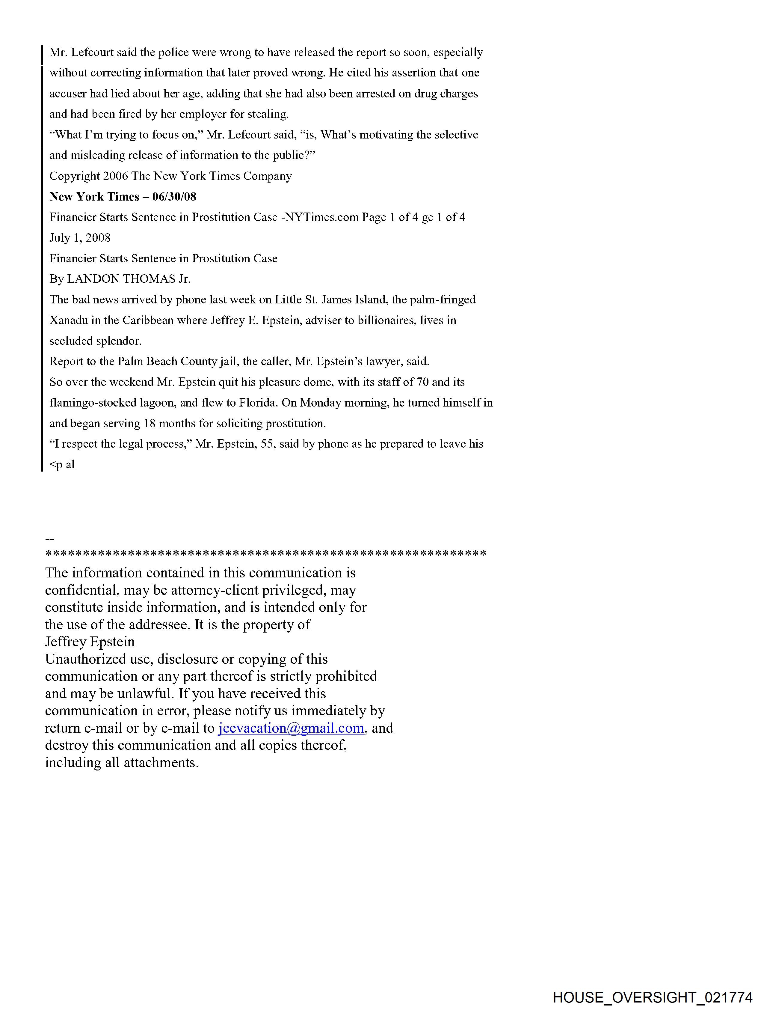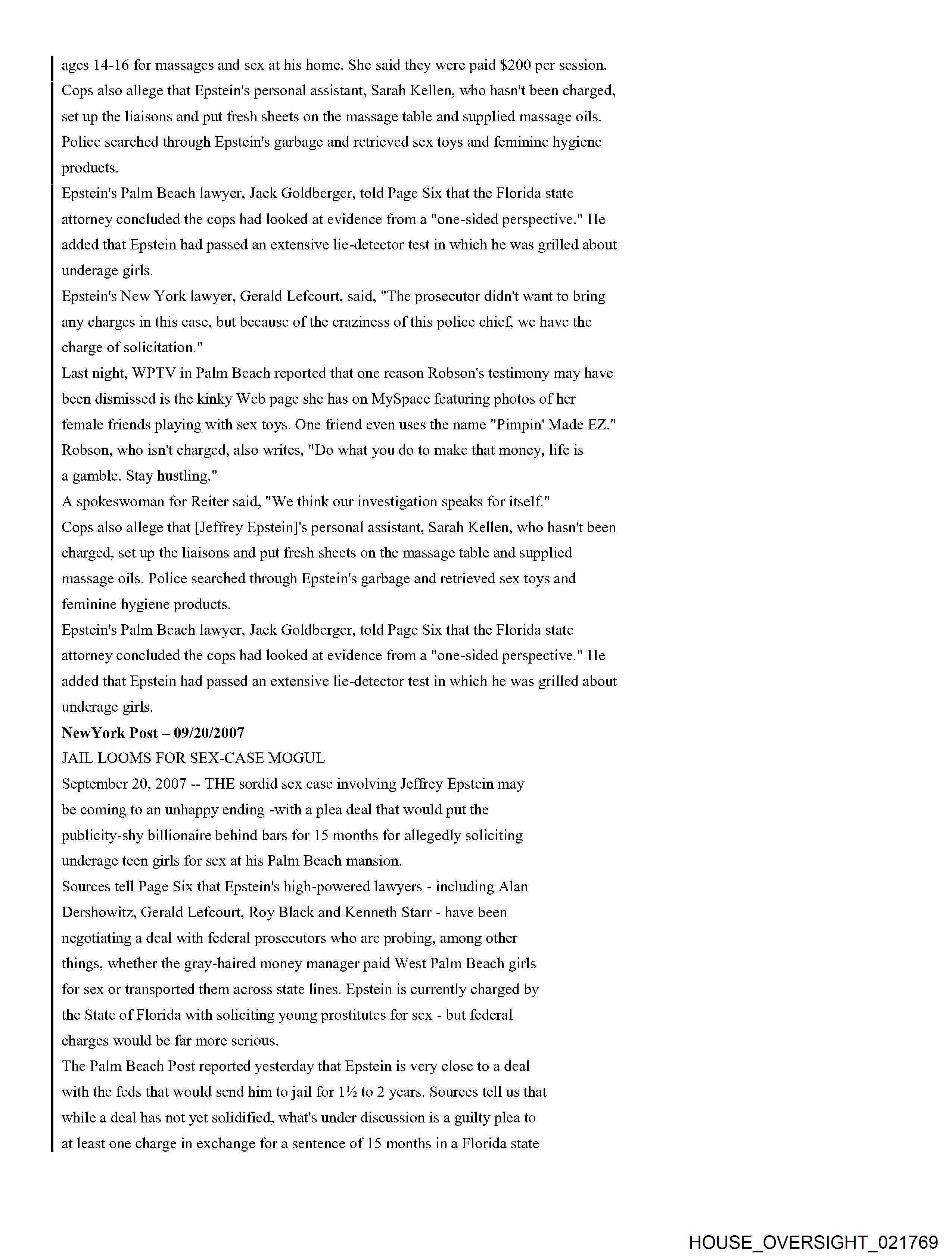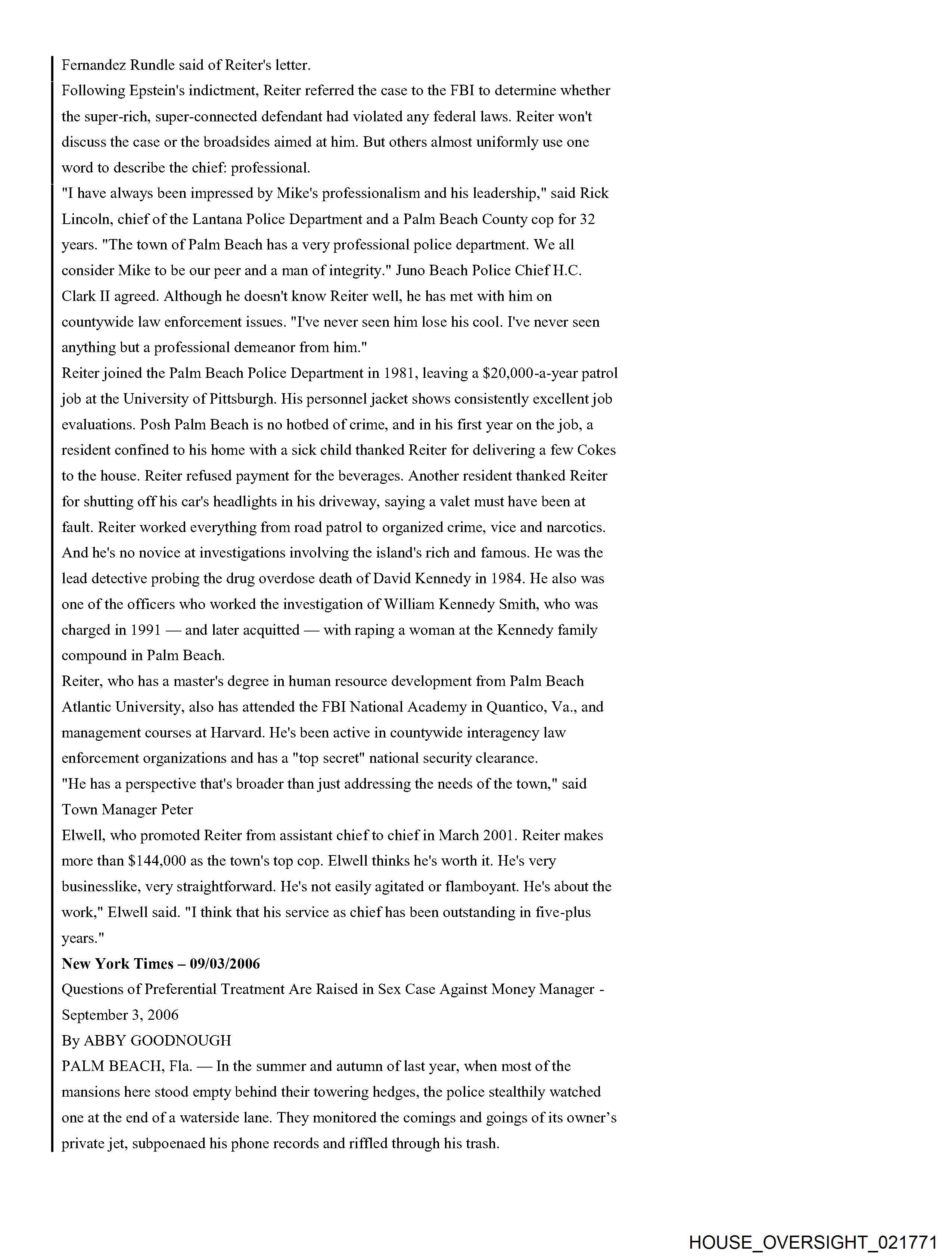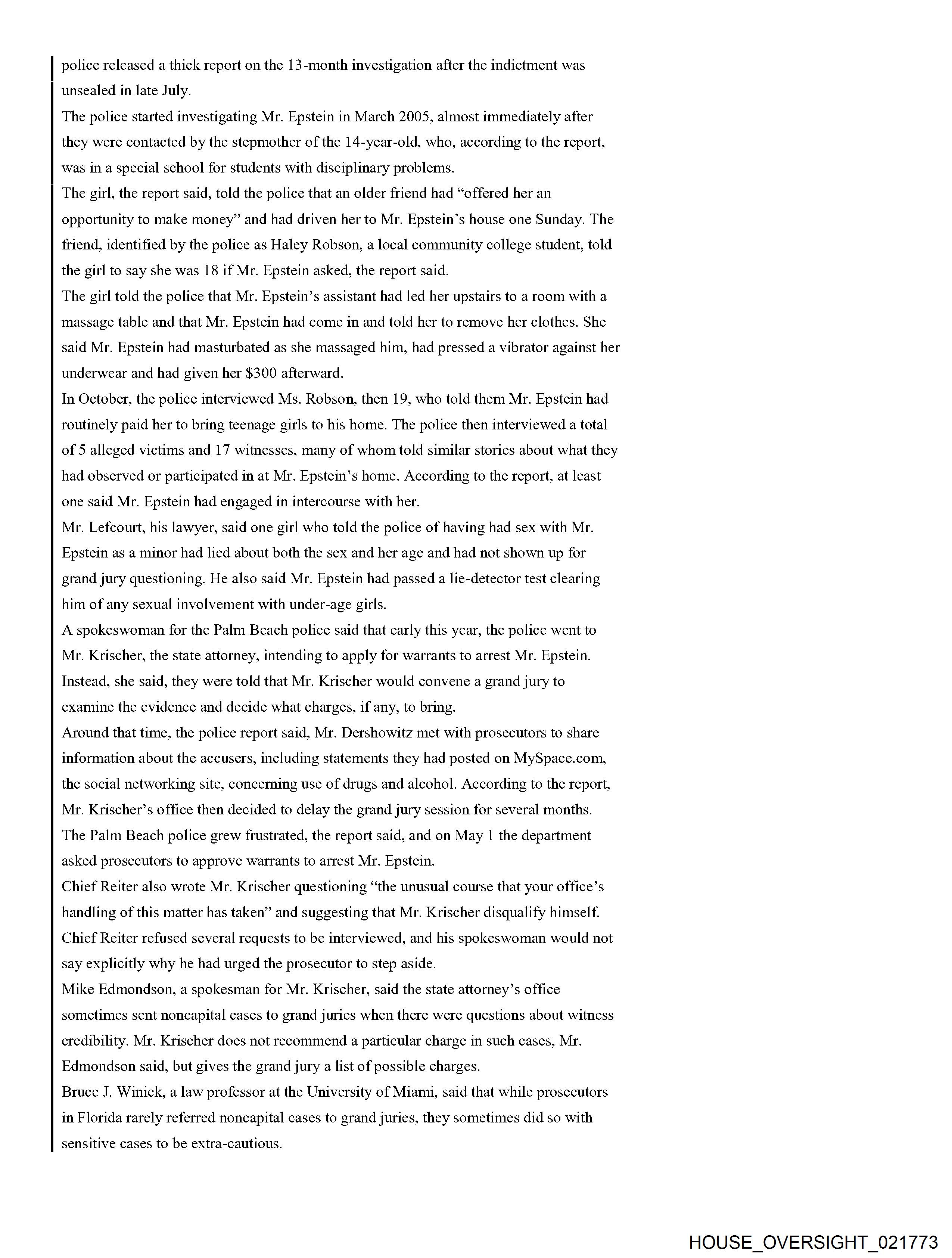 From: Jeffrey Epstein [jeevacation@gmail.com] Sent: 2/26/2010 3:01:31 PM To: Alan M. Dershowitz [REDACTED]; Martin Weinberg [REDACTED] Subject: Fwd: Fw: Epstein News Articles Attachments: Epstein combined articles.pdf Forwarded message From: [REDACTED] Date: Wed, Feb 24, 2010 at 5:53 AM Subject: Fw: Epstein News Articles To: jeevacation@gmail.com -----Forwarded by Public Records/PalmBeach on 02/24/2010 05:53AM ----- To: [REDACTED] From: Michael Reiter/PalmBeach Date: 08/12/2008 09:33PM Subject: Epstein News Articles (See attached file: Epstein combined articles.pdf) Joyce, I am looking forward to meeting with you on Wednesday. Please find below (and attached as a PDF file), some background information for your reference. Thanks for agreeing to have this discussion. Regards, Mike Palm Beach Post Editorial #1 He was over 50. And they were girls By Elisa Cramer HASH(Ox5fa474) Friday, August 04, 2006 If the women whom Palm Beach police say a part-time town resident invited to his home and paid for sex acts were, in fact, women, the solicitation charge against Jeffrey Epstein might feel more sufficient. But, according to police records, they weren't. He was over 50. And they were girls. 14. 15.16.17-year-old girls. That should count for something - the difference between prostitution and pedophilia. So, it is baffling that Mr. Epstein, who was indicted last month by a grand jury on one felony count of solicitation of prostitution, has not been charged, as Palm Beach police strenuously urged, with unlawful sex acts with a minor and lewd and lascivious molestation. Conviction of crimes against minors would mean steeper penalties than the maximum five-year prison term Mr. Epstein faces if convicted of the single count of felony solicitation. It also would help carry a message of intolerance to perverts who prey on girls. Prosecutors did not pursue charges against Mr. Epstein reflecting the age of the victims because they assumed a jury would view the girls not as victims but as promiscuous, untrustworthy, willing participants. The presumption is offensive. Mr. Epstein, a 53-year-old Manhattan money manager who has hired Harvard law professor Alan Dershowitz and defense attorney Jack Goldberger, has denied knowing how old the girls were. But police interviews with five alleged victims and 17 witnesses under oath, as well as phone messages, a high school transcript and other items that police found from searching Mr. Epstein's trash and 7,234-square-foot waterfront home, provide evidence that he knew the girls were teenagers. One girl couldn't show up when Mr. Epstein wanted because she had soccer. Another time, Mr. Epstein had to wait for his "massage" session because the girl he wanted was still in class. Why didn't State Attorney Bany Krischer let a jury decide whether to believe the teenagers - including a 16-year-old who went to Mr. Epstein's house to "work" in December 2004 after being asked whether she needed to make money for Christmas gifts? Prosecutors gave greater weight to the details Mr. Dershowitz provided about the girls in an apparent effort to assail their character. Mr. Dershowitz pointed out to prosecutors that some of the teenagers had talked on myspace.com about marijuana and alcohol use. The 20-year-old Royal Palm Beach woman who told police she recruited girls for Mr. Epstein has a Web page on myspace.com that features one girl using the name "Pimpin' Made EZ." Although no charges of witness tampering have been filed, the parents of at least one of the teenage victims complained to police of being followed and intimidated by two men. Police determined that their vehicles were registered to two private investigators. Mr. Goldberger denied knowing anything about it. Police also note in their reports that the state attorneys office offered Mr. Epstein a plea deal that would have placed him on probation for five years, allowing him ultimately to walk away with no criminal record at all. I asked Mr. Krischer's spokesman, Mike Edmondson, why the case was referred to a grand jury instead of Mr. Epstein being charged and facing a trial before a jury. And shouldn't the victims credibility be a factor to determine whether a crime's been committed, not whether a jury will convict? (After all, as Mr. Goldberger told The Palm Beach Post of Mr. Epstein, "He's never denied girls came to the house.") Especially, I asked Mr. Edmondson to explain: Why shouldn't the public look at this case and think there are two kinds of justice - one for the wealthy and one for the rest of us? Mr. Edmondson said he could not comment on the case because it is active, but on the latter point, he offered, for the sake of "philosophical debate": "Whether wealth buys a different standard of justice across the country ... the answer to that would, of course, be yes." But in this case, he said, "regardless of the battery of attorneys, the outcome would be the same. Every issue that was debated in public was debated in our office before this case went to the grand jury." In this case, it is not the victims credibility but the state attorneys that deserves questioning. Palm Beach Post Editorial #2 Massaging the system Palm Beach Post Editorial Thursday, August 10, 2006 Palm Beach police say their 11-month investigation shows that 53-year-old part-time town resident Jeffrey Epstein committed unlawful sex acts with and lewd and lascivious molestation on five underage girls. Defense attorney Jack Goldberger claims that his client, Jeffrey Epstein, had no idea that the untrained girls he hired for massages were minors. The Palm Beach Count State Attorneys Office could have let a jury decide whom to believe. Instead, State Attorney Barry Krischer left the public to wonder whether the system tilted in favor of a wealthy, well-connected alleged perpetrator and against very young girls who are alleged victims of sex crimes. Mr. Krischer took the unusual step of referring the case to a grand jury, which last month indicted J