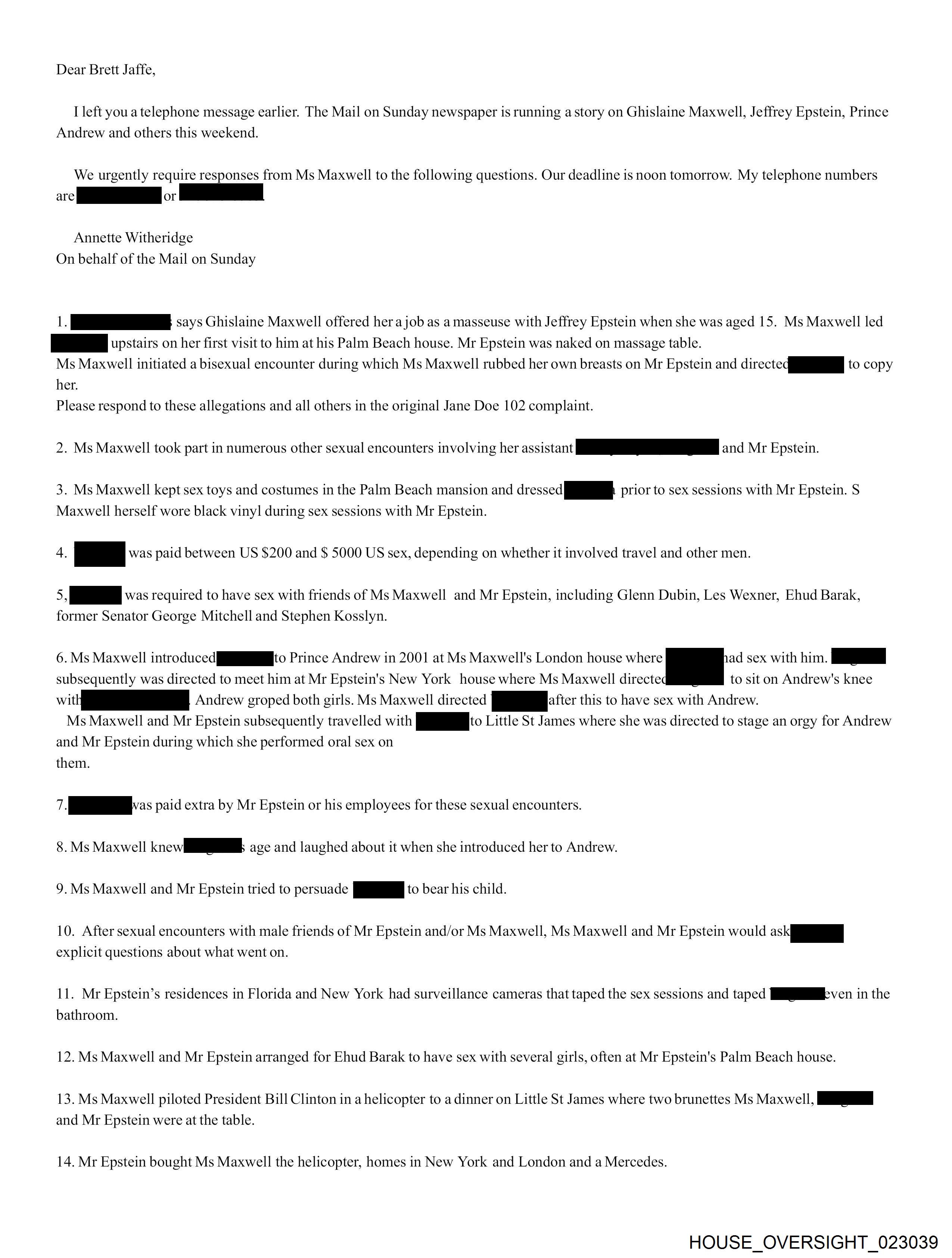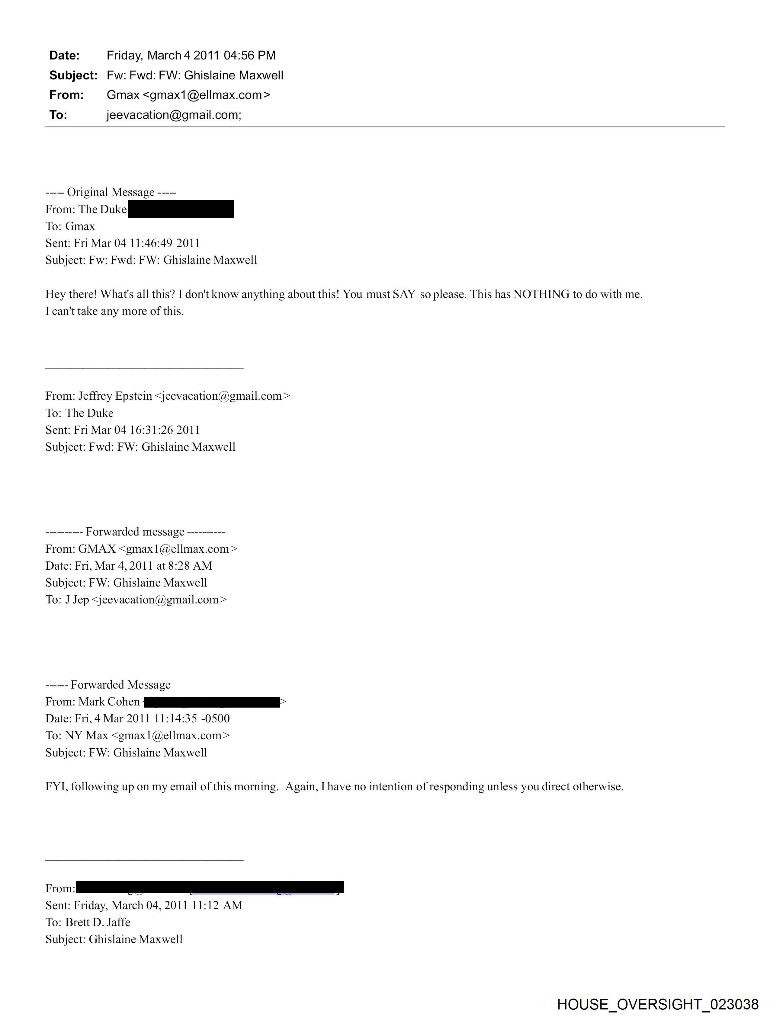 Date: Friday, March 4 2011 04:56 PM Subject: Fw: Fwd: FW: Ghislaine Maxwell From: Gmax <gmax1@ellmax.com> To: jeevacation@gmail.com; --- Original Message --- From: The Duke [REDACTED] To: Gmax Sent: Fri Mar 04 11:46:49 2011 Subject: Fw: Fwd: FW: Ghislaine Maxwell Hey there! What's all this? I don't know anything about this! You must SAY so please. This has NOTHING to do with me. I can't take any more of this. From: Jeffrey Epstein <jeevacation@gmail.com> To: The Duke Sent: Fri Mar 04 16:31:26 2011 Subject: Fwd: FW: Ghislaine Maxwell ------ Forwarded message---------- From: GMAX <gmaxl@ellmax.com> Date: Fri, Mar 4, 2011 at 8:28 AM Subject: FW: Ghislaine Maxwell To: J Jep <jeevacation@gmail.com> ---- Forwarded Message From: Mark Cohen [REDACTED] Date: Fri, 4 Mar 2011 11:14:35 -0500 To: NY Max <gmaxl@ellmax.com> Subject: FW: Ghislaine Maxwell FYI, following up on my email of this morning. Again, I have no intention of responding unless you direct otherwise. From: [REDACTED] Sent: Friday, March 04, 2011 11:12 AM To: Brett D. Jaffe Subject: Ghislaine Maxwell Dear Brett Jaffe, I left you a telephone message earlier. The Mail on Sunday newspaper is running a story on Ghislaine Maxwell, Jeffrey Epstein, Prince Andrew and others this weekend. We urgently require responses from Ms Maxwell to the following questions. Our deadline is noon tomorrow. My telephone numbers are [REDACTED] or [REDACTED] Annette Witheridge On behalf of the Mail on Sunday 1. [REDACTED] says Ghislaine Maxwell offered her a job as a masseuse with Jeffrey Epstein when she was aged 15. Ms Maxwell led [REDACTED] upstairs on her first visit to him at his Palm Beach house. Mr Epstein was naked on massage table. Ms Maxwell initiated a bisexual encounter during which Ms Maxwell rubbed her own breasts on Mr Epstein and directed [REDACTED] to copy her. Please respond to these allegations and all others in the original Jane Doe 102 complaint. 2. Ms Maxwell took part in numerous other sexual encounters involving her assistant [REDACTED] and Mr Epstein. 3. Ms Maxwell kept sex toys and costumes in the Palm Beach mansion and dressed [REDACTED] prior to sex sessions with Mr Epstein. S Maxwell herself wore black vinyl during sex sessions with Mr Epstein. 4. [REDACTED] was paid between US $200 and $ 5000 US sex, depending on whether it involved travel and other men. 5, [REDACTED] was required to have sex with friends of Ms Maxwell and Mr Epstein, including Glenn Dubin, Les Wexner, Ehud Barak, former Senator George Mitchell and Stephen Kosslyn. 6. Ms Maxwell introduced [REDACTED] to Prince Andrew in 2001 at Ms Maxwell's London house where [REDACTED] had sex with him. [REDACTED] subsequently was directed to meet him at Mr Epstein's New York house where Ms Maxwell directed [REDACTED] to sit on Andrew's knee with [REDACTED] Andrew groped both girls. Ms Maxwell directed [REDACTED] after this to have sex with Andrew. Ms Maxwell and Mr Epstein subsequently travelled with [REDACTED] to Little St James where she was directed to stage an orgy for Andrew and Mr Epstein during which she performed oral sex on them. 7. [REDACTED] was paid extra by Mr Epstein or his employees for these sexual encounters. 8. Ms Maxwell knew [REDACTED] age and laughed about it when she introduced her to Andrew. 9. Ms Maxwell and Mr Epstein tried to persuade [REDACTED] to bear his child. 10. After sexual encounters with male friends of Mr Epstein and/or Ms Maxwell, Ms Maxwell and Mr Epstein would ask [REDACTED] explicit questions about what went on. 11. Mr Epstein's residences in Florida and New York had surveillance cameras that taped the sex sessions and taped [REDACTED] even in the bathroom. 12. Ms Maxwell and Mr Epstein arranged for Ehud Barak to have sex with several girls, often at Mr Epstein's Palm Beach house. 13. Ms Maxwell piloted President Bill Clinton in a helicopter to a dinner on Little St James where two brunettes Ms Maxwell, [REDACTED] and Mr Epstein were at the table. 14. Mr Epstein bought Ms Maxwell the helicopter, homes in New York and London and a Mercedes. ---- End of Forwarded Message The information contained in this communication is confidential, may be attorney-client privileged, may constitute inside information, and is intended only for the use of the addressee. It is the property of Jeffrey Epstein Unauthorized use, disclosure or copying of this communication or any part thereof is strictly prohibited and may be unlawful. If you have received this communication in error, please notify us immediately by return e-mail or by e-mail to jeevacation@gmail.com , and destroy this communication and all copies thereof, including all attachments. copyright -all rights reserved HOUSE OVERSIGHT 023038 HOUSE OVERSIGHT 023039 HOUSE OVERSIGHT 023040