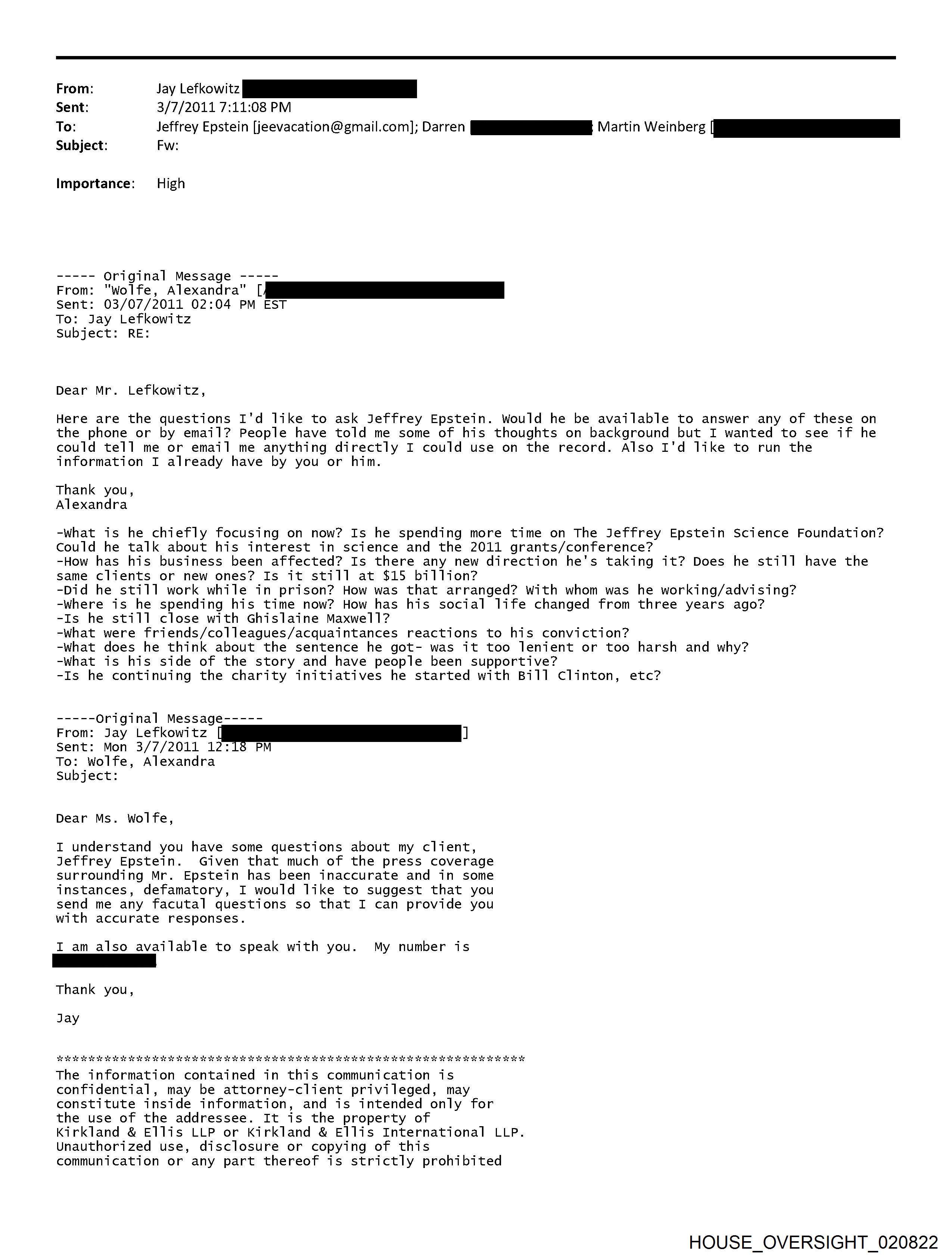 From: Jay Lefkowitz [REDACTED] Sent: 3/7/2011 7:11:08 PM To: Jeffrey Epstein [jeevacation@gmail.com]; Darren [REDACTED]; Martin Weinberg [REDACTED] Subject: Fw: Importance: High ----- Original Message ----- From: "Wolfe, Alexandra" [REDACTED] Sent: 03/07/2011 02:04 PM EST To: Jay Lefkowitz Subject: RE: Dear Mr. Lefkowitz, Here are the questions I'd like to ask Jeffrey Epstein. Would he be available to answer any of these on the phone or by email? People have told me some of his thoughts on background but I wanted to see if he could tell me or email me anything directly I could use on the record. Also I'd like to run the information I already have by you or him. Thank you, Alexandra -What is he chiefly focusing on now? Is he spending more time on The Jeffrey Epstein Science Foundation? Could he talk about his interest in science and the 2011 grants/conference? -How has his business been affected? Is there any new direction he's taking it? Does he still have the same clients or new ones? Is it still at $15 billion? -Did he still work while in prison? How was that arranged? With whom was he working/advising? -Where is he spending his time now? How has his social life changed from three years ago? -Is he still close with Ghislaine Maxwell? -What were friends/colleagues/acquaintances reactions to his conviction? -What does he think about the sentence he got- was it too lenient or too harsh and why? -What is his side of the story and have people been supportive? -Is he continuing the charity initiatives he started with Bill Clinton, etc? -----Original Message----- From: Jay Lefkowitz [REDACTED] Sent: Mon 3/7/2011 12:18 PM To: Wolfe, Alexandra Subject: Dear Ms. Wolfe, I understand you have some questions about my client, Jeffrey Epstein. Given that much of the press coverage surrounding Mr. Epstein has been inaccurate and in some instances, defamatory, I would like to suggest that you send me any facutal questions so that I can provide you with accurate responses. I am also available to speak with you. My number is [REDACTED] Thank you, Jay The information contained in this communication is confidential, may be attorney-client privileged, may constitute inside information, and is intended only for the use of the addressee. It is the property of Kirkland & Ellis LLP or Kirkland & Ellis International LLP. Unauthorized use, disclosure or copying of this communication or any part thereof is strictly prohibited and may be unlawful. If you have received this communication in error, please notify us immediately by return e-mail or by e-mail to postmaster@kirkland.com, and destroy this communication and all copies thereof, including all attachments. HOUSE OVERSIGHT 020822 HOUSE OVERSIGHT 020823