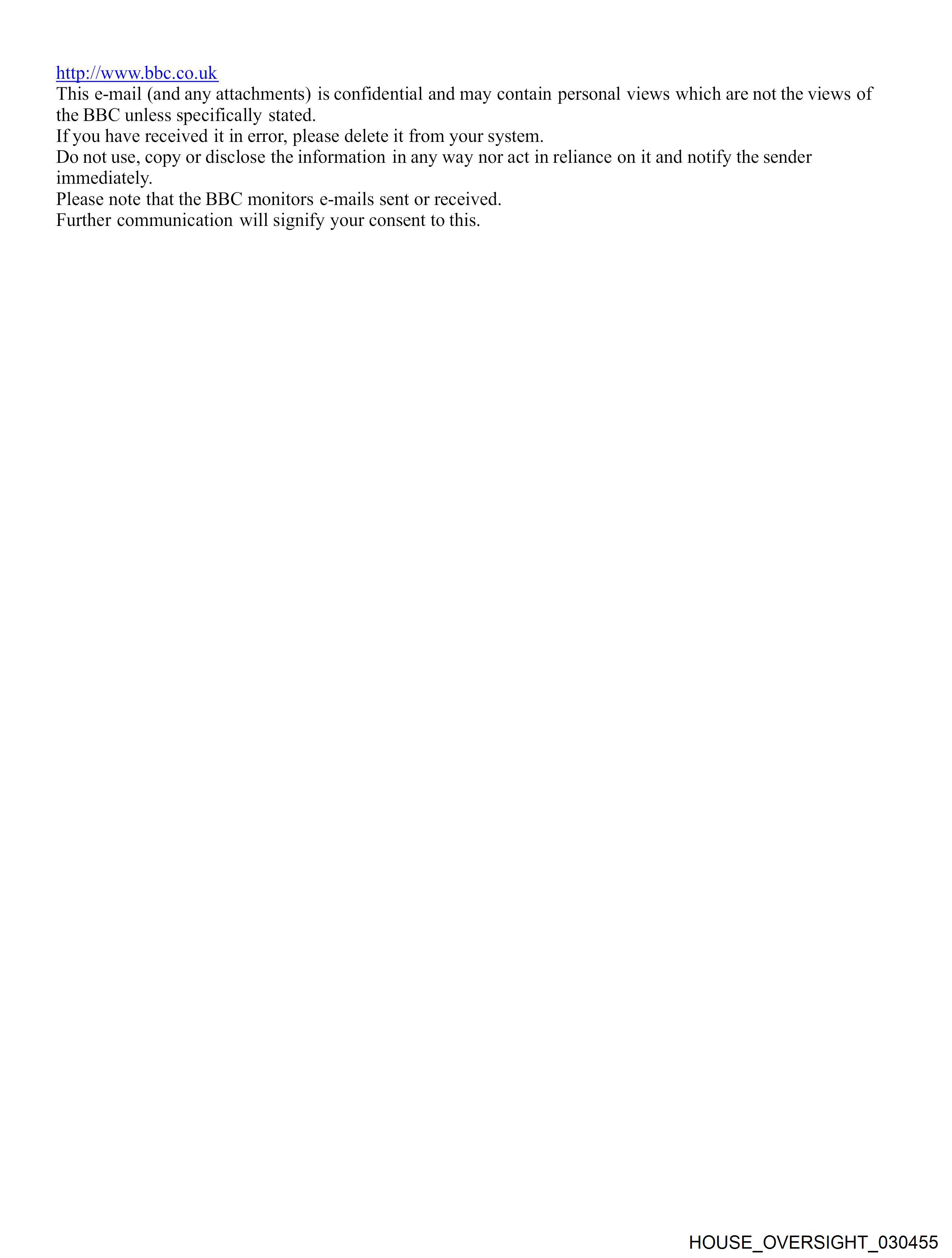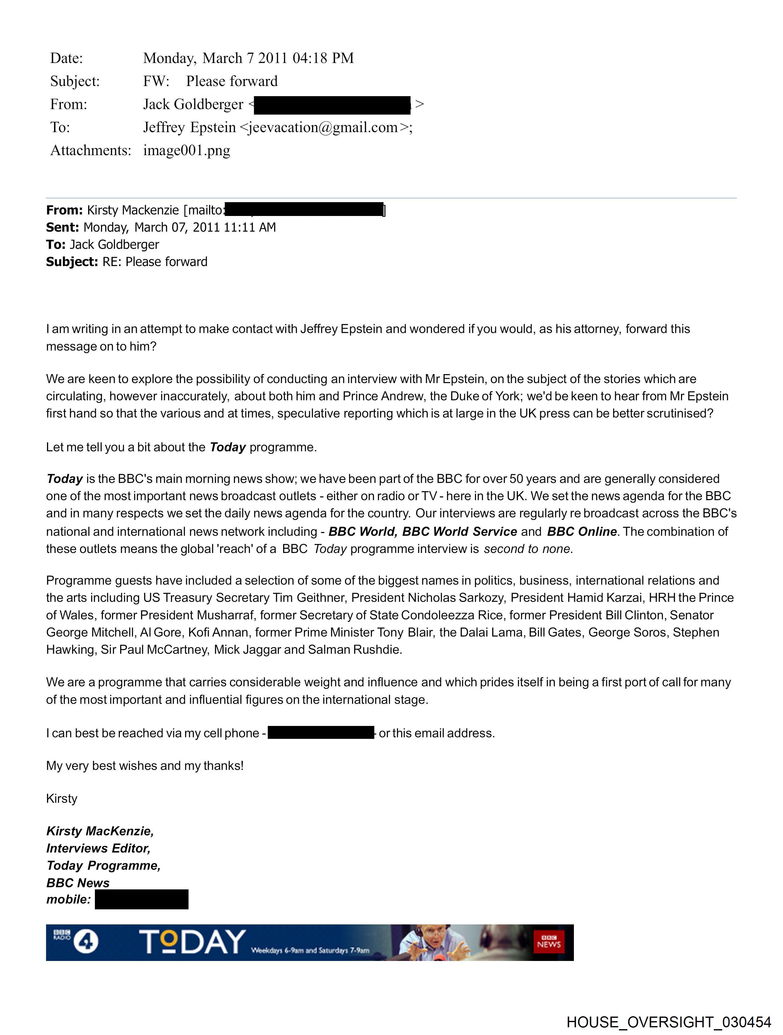 Date: Monday, March 7 2011 04:18 PM Subject: FW: Please forward From: Jack Goldberger <[REDACTED]> To: Jeffrey Epstein <jeevacation@gmail.com>; Attachments: image001.png From: Kirsty Mackenzie [mailto: [REDACTED] Sent: Monday, March 07, 2011 11:11 AM To: Jack Goldberger Subject: RE: Please forward I am writing in an attempt to make contact with Jeffrey Epstein and wondered if you would, as his attorney, forward this message on to him? We are keen to explore the possibility of conducting an interview with Mr Epstein, on the subject of the stories which are circulating, however inaccurately, about both him and Prince Andrew, the Duke of York; we'd be keen to hear from Mr Epstein first hand so that the various and at times, speculative reporting which is at large in the UK press can be better scrutinised? Let me tell you a bit about the Today programme. Today is the BBC's main morning news show; we have been part of the BBC for over 50 years and are generally considered one of the most important news broadcast outlets - either on radio or TV- here in the UK. We set the news agenda for the BBC and in many respects we set the daily news agenda for the country. Our interviews are regularly re broadcast across the BBC's national and international news network including - BBC World, BBC World Service and BBC Online. The combination of these outlets means the global 'reach' of a BBC Today programme interview is second to none. Programme guests have included a selection of some of the biggest names in politics, business, international relations and the arts including US Treasury Secretary Tim Geithner, President Nicholas Sarkozy, President Hamid Karzai, HRH the Prince of Wales, former President Musharraf, former Secretary of State Condoleezza Rice, former President Bill Clinton, Senator George Mitchell, Al Gore, Kofi Annan, former Prime Minister Tony Blair, the Dalai Lama, Bill Gates, George Soros, Stephen Hawking, Sir Paul McCartney, Mick Jaggar and Salman Rushdie. We are a programme that carries considerable weight and influence and which prides itself in being a first port of call for many of the most important and influential figures on the international stage. I can best be reached via my cell phone -[REDACTED]- or this email address. My very best wishes and my thanks! Kirsty Kirsty MacKenzie, Interviews Editor, Today Programme, BBC News mobile: [REDACTED] http://www.bbc.co.uk This e-mail (and any attachments) is confidential and may contain personal views which are not the views of the BBC unless specifically stated. If you have received it in error, please delete it from your system. Do not use, copy or disclose the information in any way nor act in reliance on it and notify the sender immediately. Please note that the BBC monitors e-mails sent or received. Further communication will signify your consent to this. HOUSE OVERSIGHT 030454 HOUSE OVERSIGHT 030455