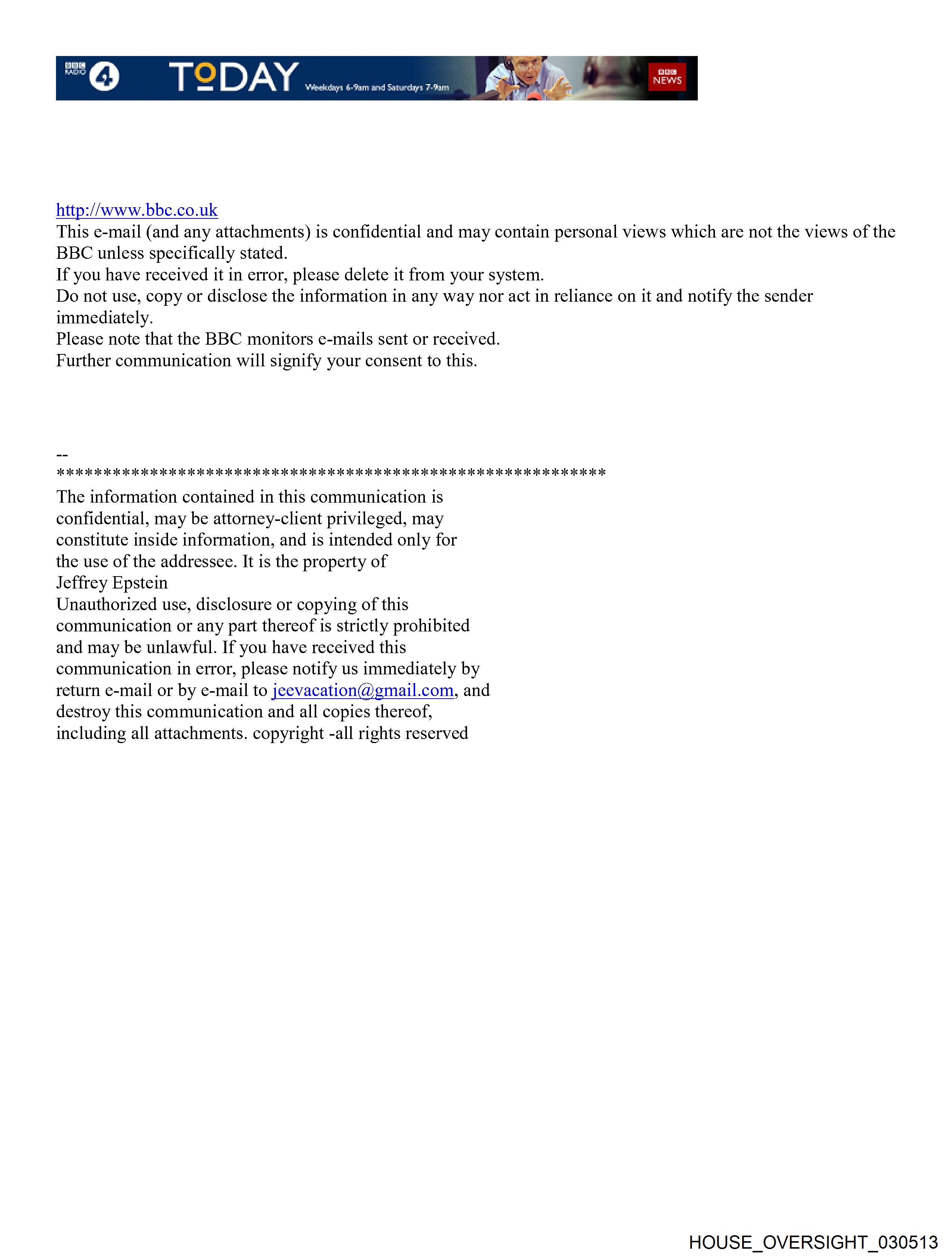 From: Jeffrey Epstein [jeevacation@gmail.com] Sent: 3/7/2011 4:42:11 PM To: Gmax [gmax1@ellmax.com] Subject: Fwd: FW: Please forward Attachments: image001.png ----------Forwarded message---------- From: Jack Goldberger <REDACTED> Date: Mon, Mar 7, 2011 at 8:18 AM Subject: FW: Please forward To: Jeffrey Epstein <jeevacation@gmail.com> From: Kirsty Mackenzie [mailto: [REDACTED] Sent: Monday, March 07, 2011 11:11 AM To: Jack Goldberger Subject: RE: Please forward I am writing in an attempt to make contact with Jeffrey Epstein and wondered if you would, as his attorney, forward this message on to him? We are keen to explore the possibility of conducting an interview with Mr Epstein, on the subject of the stories which are circulating, however inaccurately, about both him and Prince Andrew, the Duke of York; we'd be keen to hear from Mr Epstein first hand so that the various and at times, speculative reporting which is at large in the UK press can be better scrutinised? Let me tell you a bit about the Today programme. Today is the BBC's main morning news show; we have been part of the BBC for over 50 years and are generally considered one of the most important news broadcast outlets - either on radio or TV- here in the UK. We set the news agenda for the BBC and in many respects we set the daily news agenda for the country. Our interviews are regularly re broadcast across the BBC's national and international news network including - BBC World, BBC World Service and BBC Online. The combination of these outlets means the global 'reach' of a BBC Today programme interview is second to none. Programme guests have included a selection of some of the biggest names in politics, business, international relations and the arts including US Treasury Secretary Tim Geithner, President Nicholas Sarkozy, President Hamid Karzai, HRH the Prince of Wales, former President Musharraf, former Secretary of State Condoleezza Rice, former President Bill Clinton, Senator George Mitchell, Al Gore, Kofi Annan, former Prime Minister Tony Blair, the Dalai Lama, Bill Gates, George Soros, Stephen Hawking, Sir Paul McCartney, Mick Jaggar and Salman Rushdie. We are a programme that carries considerable weight and influence and which prides itself in being a first port of call for many of the most important and influential figures on the international stage. I can best be reached via my cell phone -[REDACTED]- or this email address. My very best wishes and my thanks! Kirsty Kirsty MacKenzie, Interviews Editor, Today Programme, BBC News mobile: [REDACTED] http://www.bbc.co.uk This e-mail (and any attachments) is confidential and may contain personal views which are not the views of the BBC unless specifically stated. If you have received it in error, please delete it from your system. Do not use, copy or disclose the information in any way nor act in reliance on it and notify the sender immediately. Please note that the BBC monitors e-mails sent or received. Further communication will signify your consent to this. HOUSE OVERSIGHT 030512 HOUSE OVERSIGHT 030513