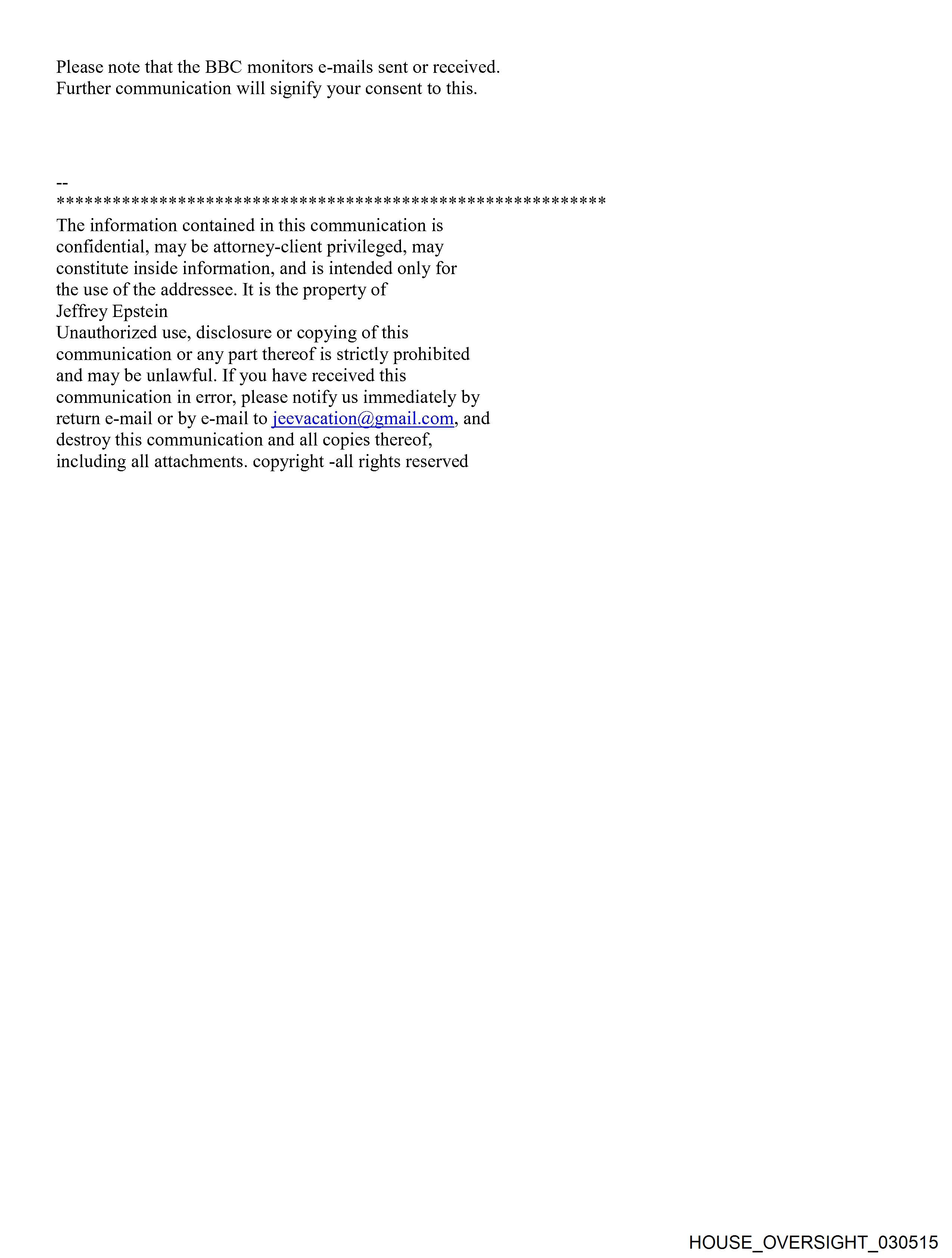 From: Jeffrey Epstein [jeevacation@gmail.com] Sent: 3/7/2011 5:03:12 PM To: Peggy Siegal [REDACTED] Subject: crazy Attachments: image001.png From: Kirsty Mackenzie [mailto: [REDACTED] Sent: Monday, March 07, 2011 11:11 AM I am writing in an attempt to make contact with Jeffrey Epstein and wondered if you would, as his attorney, forward this message on to him? We are keen to explore the possibility of conducting an interview with Mr Epstein, on the subject of the stories which are circulating, however inaccurately, about both him and Prince Andrew, the Duke of York; we'd be keen to hear from Mr Epstein first hand so that the various and at times, speculative reporting which is at large in the UK press can be better scrutinised? Let me tell you a bit about the Today programme. Today is the BBC's main morning news show; we have been part of the BBC for over 50 years and are generally considered one of the most important news broadcast outlets - either on radio or TV- here in the UK. We set the news agenda for the BBC and in many respects we set the daily news agenda for the country. Our interviews are regularly re broadcast across the BBC's national and international news network including - BBC World, BBC World Service and BBC Online. The combination of these outlets means the global 'reach' of a BBC Today programme interview is second to none. Programme guests have included a selection of some of the biggest names in politics, business, international relations and the arts including US Treasury Secretary Tim Geithner, President Nicholas Sarkozy, President Hamid Karzai, HRH the Prince of Wales, former President Musharraf, former Secretary of State Condoleezza Rice, former President Bill Clinton, Senator George Mitchell, Al Gore, Kofi Annan, former Prime Minister Tony Blair, the Dalai Lama, Bill Gates, George Soros, Stephen Hawking, Sir Paul McCartney, Mick Jaggar and Salman Rushdie. We are a programme that carries considerable weight and influence and which prides itself in being a first port of call for many of the most important and influential figures on the international stage. I can best be reached via my cell phone -[REDACTED]- or this email address. My very best wishes and my thanks! Kirsty Kirsty MacKenzie, Interviews Editor, Today Programme, BBC News mobile: [REDACTED] http://www.bbc.co.uk This e-mail (and any attachments) is confidential and may contain personal views which are not the views of the BBC unless specifically stated. If you have received it in error, please delete it from your system. Do not use, copy or disclose the information in any way nor act in reliance on it and notify the sender immediately. Please note that the BBC monitors e-mails sent or received. Further communication will signify your consent to this. HOUSE OVERSIGHT 030514 HOUSE OVERSIGHT 030515