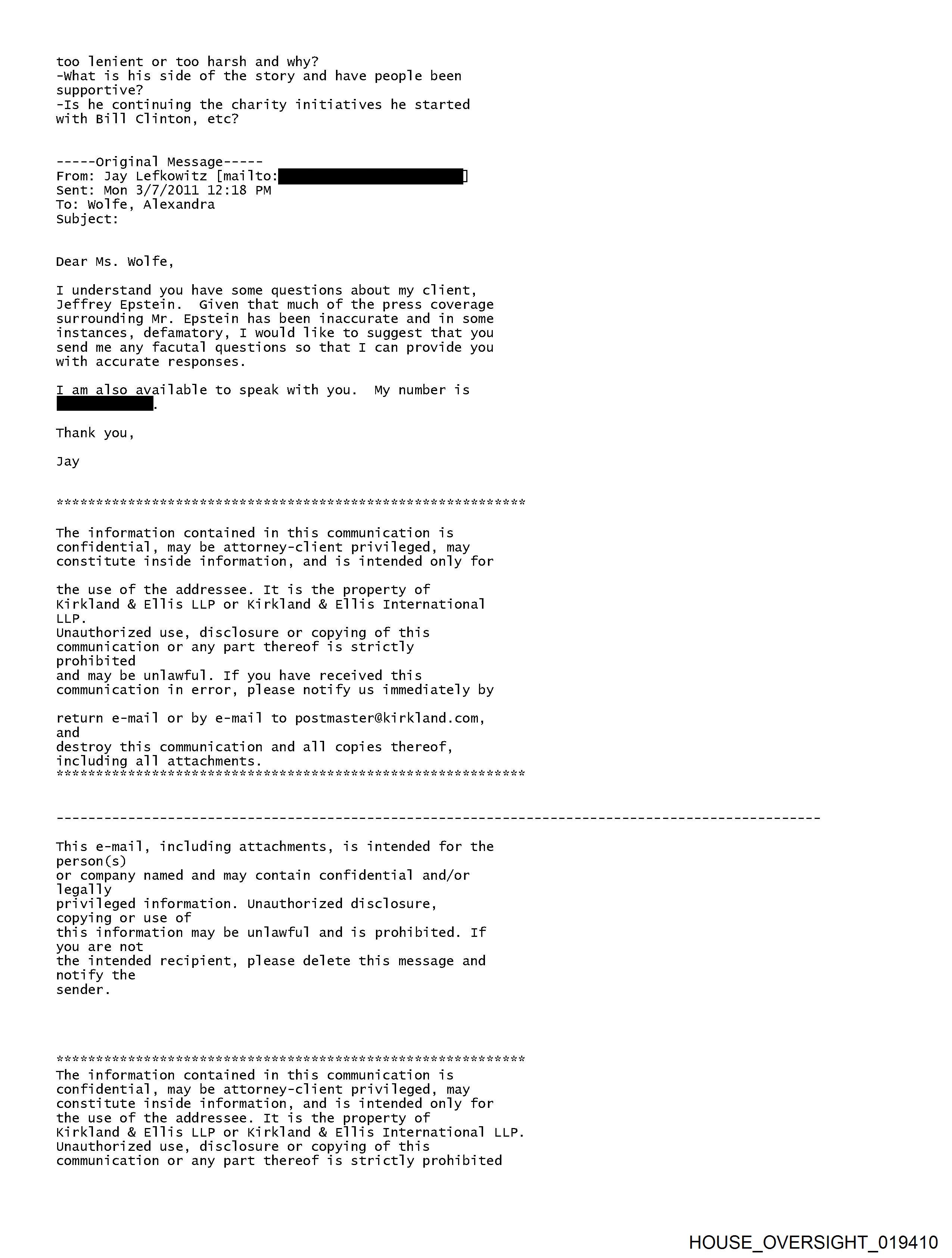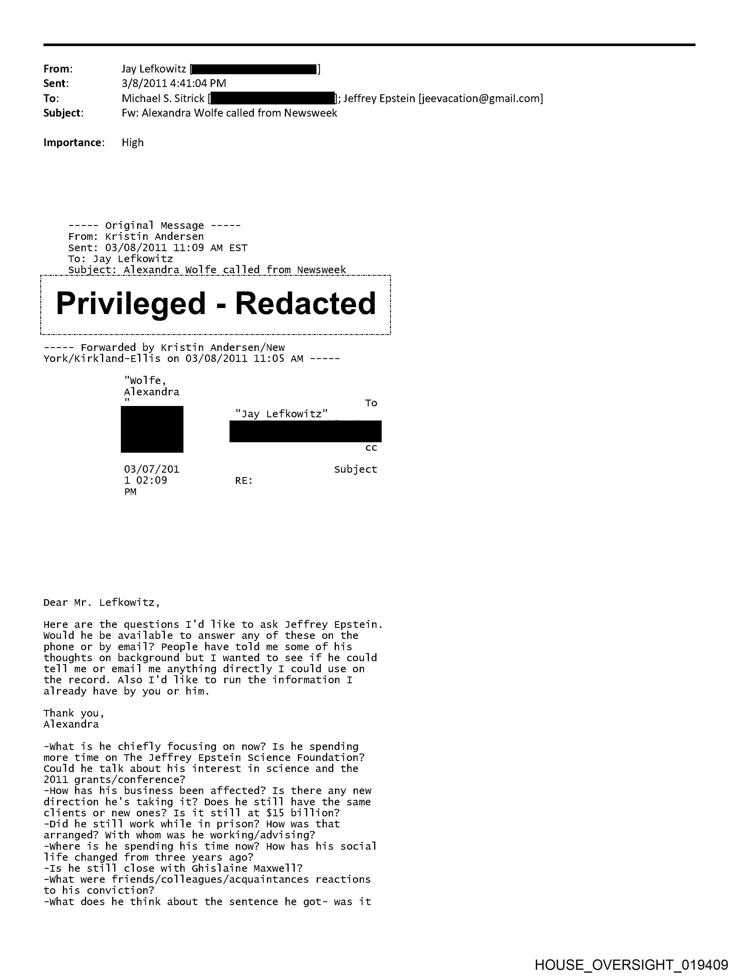 From: Jay Lefkowitz [REDACTED] Sent: 3/8/2011 4:41:04 PM To: Michael S. Sitrick [REDACTED]; Jeffrey Epstein [jeevacation@gmail.com] Subject: Fw: Alexandra Wolfe called from Newsweek Importance: High ----- Original Message ----- From: Kristin Andersen Sent: 03/08/2011 11:09 AM EST To: Jay Lefkowitz Subjct: Alexandra Wolfe called from Newsweek [Privileged - Redacted] ----- Forwarded by Kristin Andersen/New York/Kirkland-Ellis on 03/08/2011 11:05 AM ----- From: "Wolfe, Alexandra" [REDACTED] Sent: 03/07/2011 02:04 PM EST To: Jay Lefkowitz Subject: RE: Dear Mr. Lefkowitz, Here are the questions I'd like to ask Jeffrey Epstein. Would he be available to answer any of these on the phone or by email? People have told me some of his thoughts on background but I wanted to see if he could tell me or email me anything directly I could use on the record. Also I'd like to run the information I already have by you or him. Thank you, Alexandra -What is he chiefly focusing on now? Is he spending more time on The Jeffrey Epstein Science Foundation? Could he talk about his interest in science and the 2011 grants/conference? -How has his business been affected? Is there any new direction he's taking it? Does he still have the same clients or new ones? Is it still at $15 billion? -Did he still work while in prison? How was that arranged? With whom was he working/advising? -Where is he spending his time now? How has his social life changed from three years ago? -Is he still close with Ghislaine Maxwell? -What were friends/colleagues/acquaintances reactions to his conviction? -What does he think about the sentence he got- was it too lenient or too harsh and why? -What is his side of the story and have people been supportive? -Is he continuing the charity initiatives he started with Bill Clinton, etc? -----Original Message----- From: Jay Lefkowitz [REDACTED] Sent: Mon 3/7/2011 12:18 PM To: Wolfe, Alexandra Subject: Dear Ms. Wolfe, I understand you have some questions about my client, Jeffrey Epstein. Given that much of the press coverage surrounding Mr. Epstein has been inaccurate and in some instances, defamatory, I would like to suggest that you send me any facutal questions so that 1 can provide you with accurate responses. I am also available to speak with you. My number is [REDACTED] Thank you, Jay The information contained in this communication is confidential, may be attorney-client privileged, may constitute inside information, and is intended only for the use of the addressee. It is the property of Kirkland & Ellis LLP or Kirkland & Ellis International LLP. Unauthorized use, disclosure or copying of this communication or any part thereof is strictly prohibited and may be unlawful. If you have received this communication in error, please notify us immediately by return e-mail or by e-mail to postmaster@kirkland.com, and destroy this communication and all copies thereof, including all attachments. HOUSE OVERSIGHT 019409 HOUSE OVERSIGHT 019410 HOUSE OVERSIGHT 019411