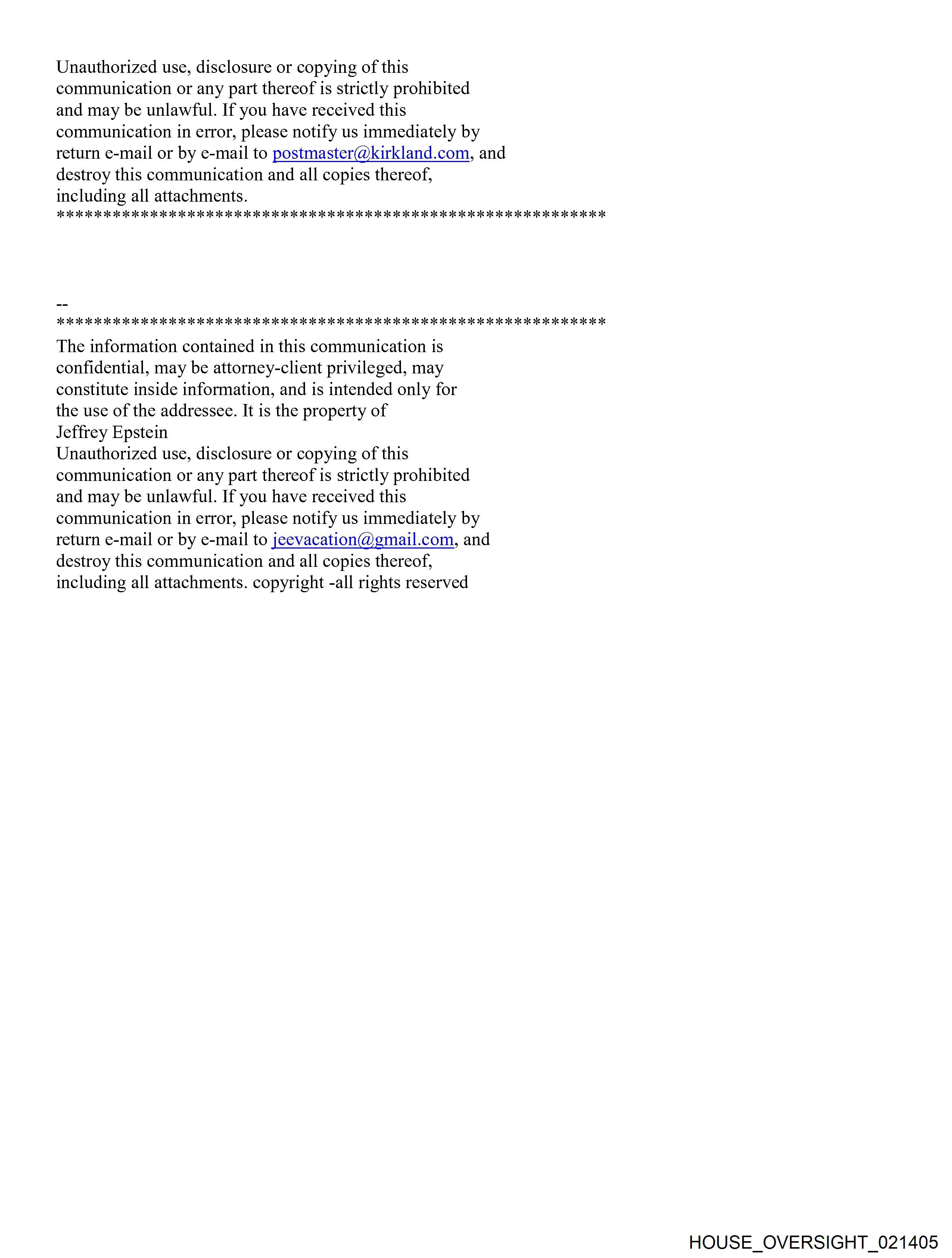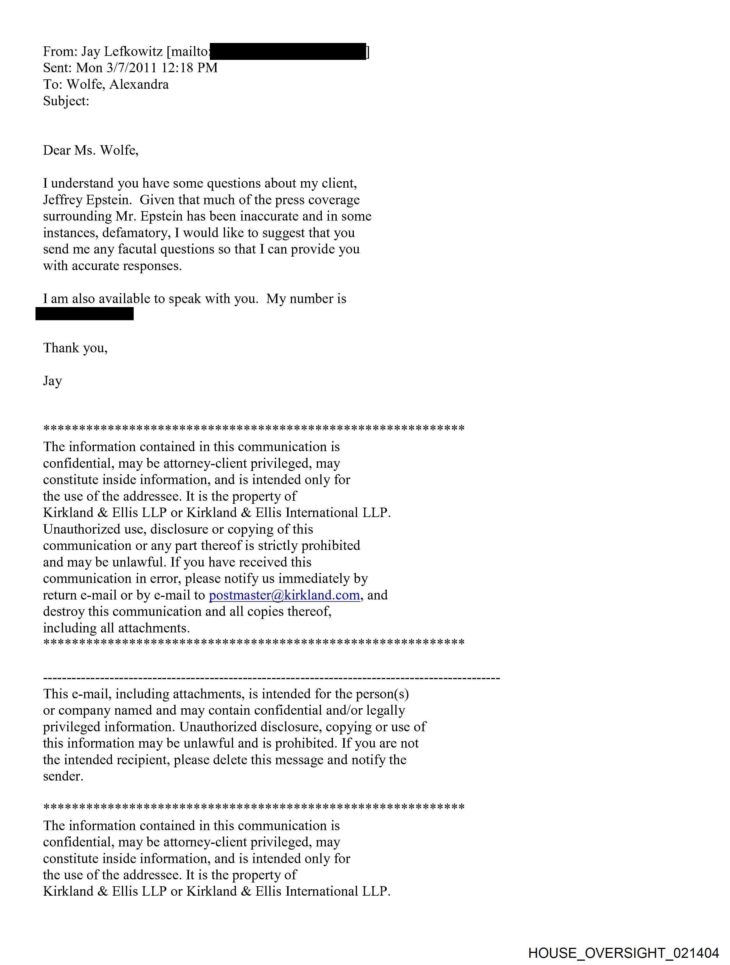From: Jeffrey Epstein [jeevacation@gmail.com] Sent: 3/8/2011 1:10:38 AM To: Mike Sitrick [REDACTED] Subject: Fwd: Fw: ----------Forwarded message---------- From: Jay Lefkowitz [REDACTED] Date: Mon, Mar 7, 2011 at 11:11 AM Subject: Fw: To: Jeffrey Epstein <jeevacation@gmail.com>, Darren <[REDACTED]>, Martin Weinberg <[REDACTED]> -----Original Message----- From: "Wolfe, Alexandra" [REDACTED] Sent: 03/07/2011 02:04 PM EST To: Jay Lefkowitz Subject: RE: Dear Mr. Lefkowitz, Here are the questions I'd like to ask Jeffrey Epstein. Would he be available to answer any of these on the phone or by email? People have told me some of his thoughts on background but I wanted to see if he could tell me or email me anything directly I could use on the record. Also I'd like to run the information I already have by you or him. Thank you, Alexandra -What is he chiefly focusing on now? Is he spending more time on The Jeffrey Epstein Science Foundation? Could he talk about his interest in science and the 2011 grants/conference? -How has his business been affected? Is there any new direction he's taking it? Does he still have the same clients or new ones? Is it still at $15 billion? -Did he still work while in prison? How was that arranged? With whom was he working/advising? -Where is he spending his time now? How has his social life changed from three years ago? -Is he still close with Ghislaine Maxwell? -What were friends/colleagues/acquaintances reactions to his conviction? -What does he think about the sentence he got- was it too lenient or too harsh and why? -What is his side of the story and have people been supportive? -Is he continuing the charity initiatives he started with Bill Clinton, etc? -----Original Message----- From: Jay Lefkowitz [REDACTED] Sent: Mon 3/7/2011 12:18 PM To: Wolfe, Alexandra Subject: Dear Ms. Wolfe, I understand you have some questions about my client, Jeffrey Epstein. Given that much of the press coverage surrounding Mr. Epstein has been inaccurate and in some instances, defamatory, I would like to suggest that you send me any facutal questions so that 1 can provide you with accurate responses. I am also available to speak with you. My number is [REDACTED] Thank you, Jay The information contained in this communication is confidential, may be attorney-client privileged, may constitute inside information, and is intended only for the use of the addressee. It is the property of Kirkland & Ellis LLP or Kirkland & Ellis International LLP. Unauthorized use, disclosure or copying of this communication or any part thereof is strictly prohibited and may be unlawful. If you have received this communication in error, please notify us immediately by return e-mail or by e-mail to postmaster@kirkland.com, and destroy this communication and all copies thereof, including all attachments. HOUSE OVERSIGHT 021403 HOUSE OVERSIGHT 021404 HOUSE OVERSIGHT 021405