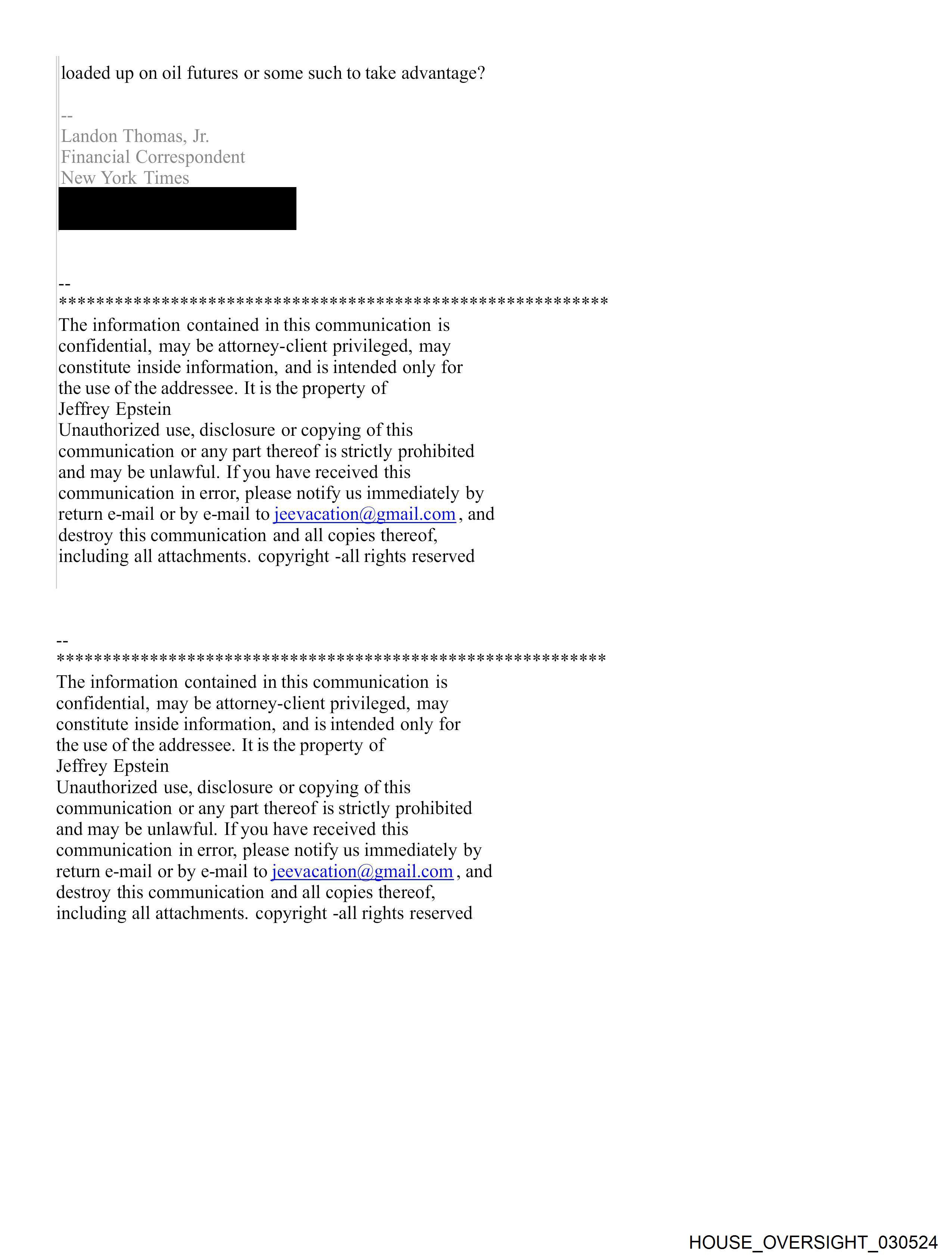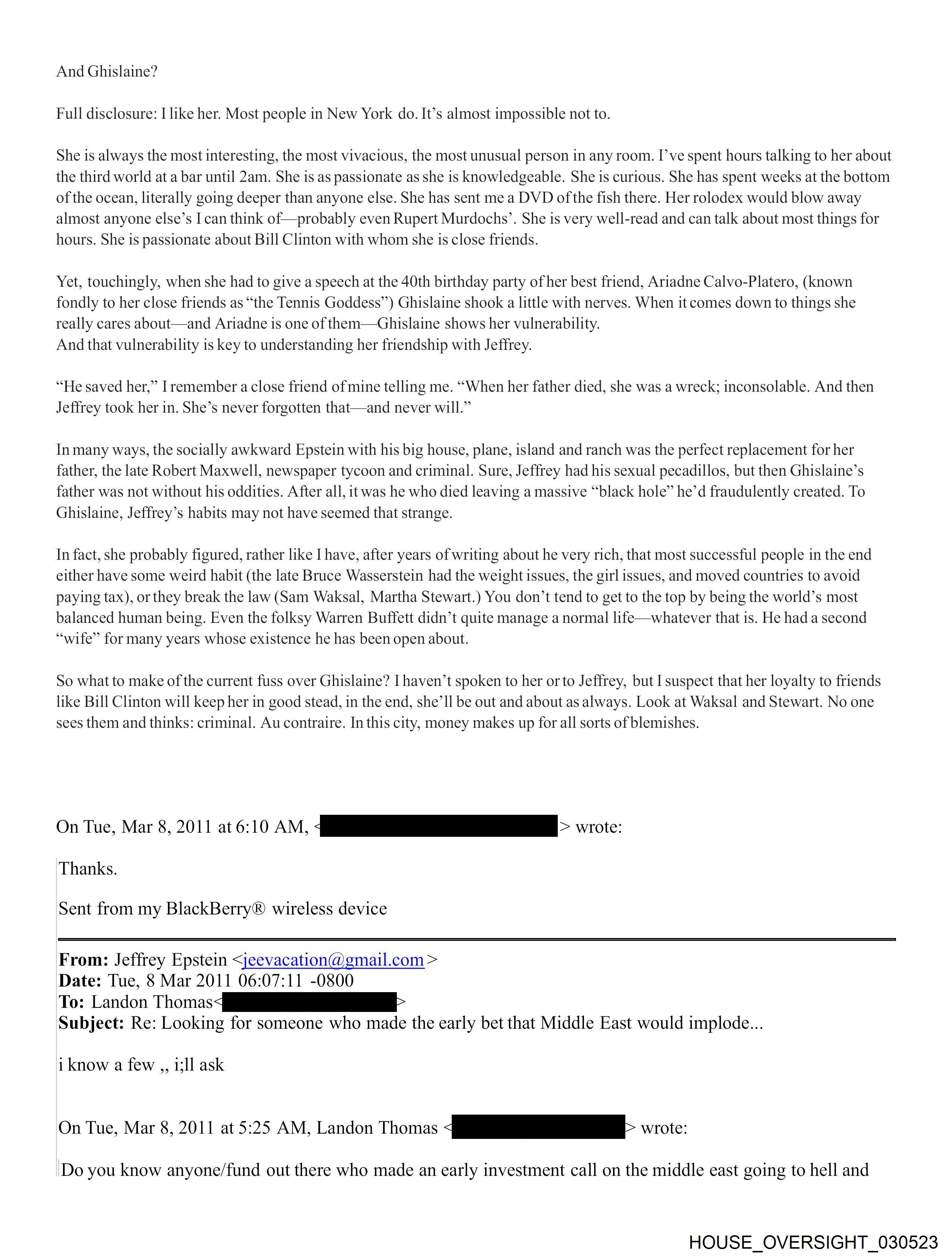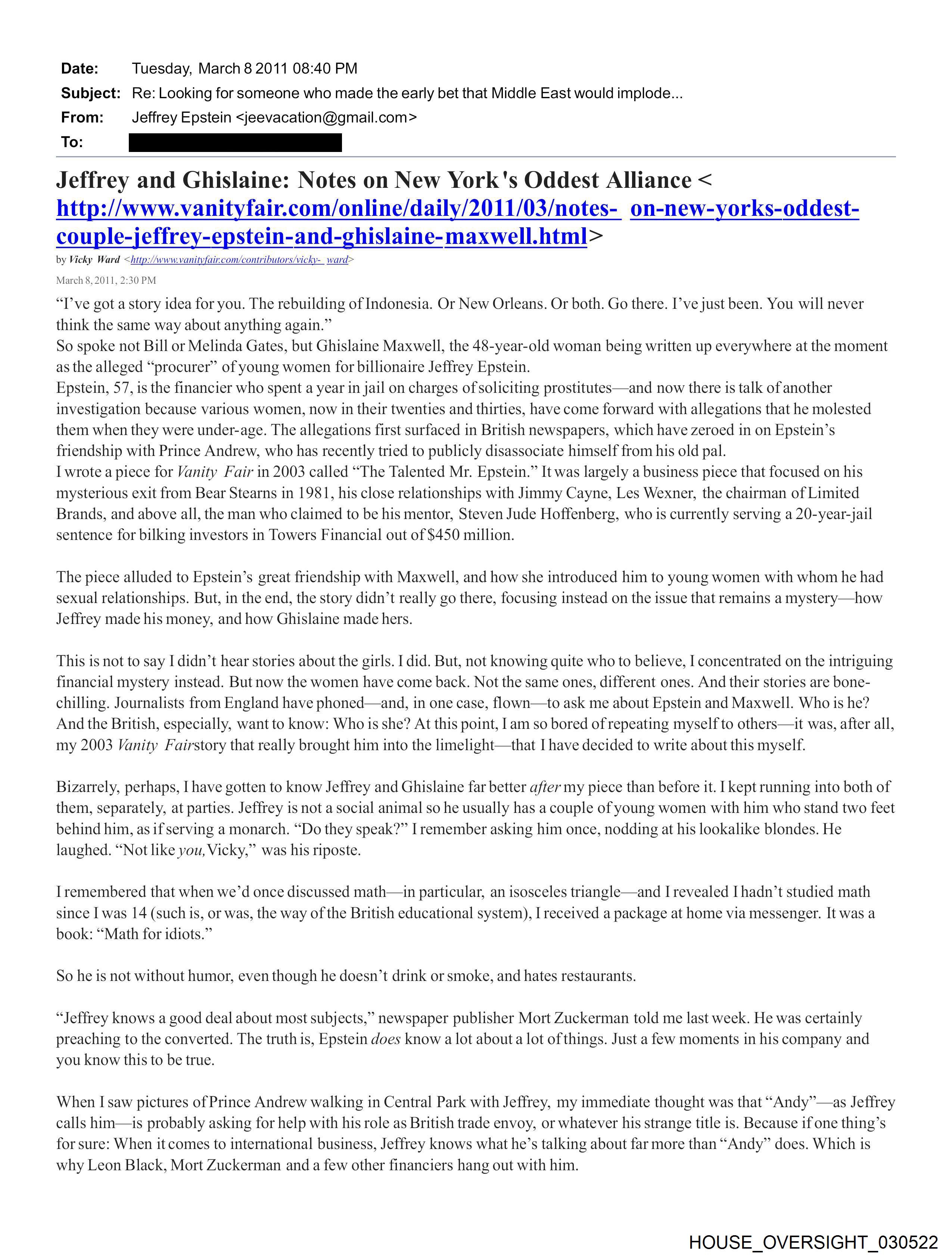 Date: Tuesday, March 8 2011 08:40 PM Subject: Re: Looking for someone who made the early bet that Middle East would implode... From: Jeffrey Epstein <jeevacation©gmail.com> To: [REDACTED] Jeffrey and Ghislaine: Notes on New York's Oddest Alliance <http://www.vanityfair.com/online/daily/2011/03/notes-on-new-yorks-oddest-couple-jeffrey- epstein-and-ghislaine-maxwell.html> by Vicky Ward <http://www.vanityfair.com/contributors/vicky-ward> March 8, 2011, 2:30 PM “I’ve got a story idea for you. The rebuilding of Indonesia. Or New Orleans. Or both. Go there. I’ve just been. You will never think the same way about anything again.” So spoke not Bill or Melinda Gates, but Ghislaine Maxwell, the 48-year-old woman being written up everywhere at the moment as the alleged “procurer” of young women for billionaire Jeffrey Epstein. Epstein, 57, is the financier who spent a year in jail on charges of soliciting prostitutes— and now there is talk of another investigation because various women, now in their twenties and thirties, have come forward with allegations that he molested them when they were under-age. The allegations first surfaced in British newspapers, which have zeroed in on Epstein’s friendship with Prince Andrew, who has recently tried to publicly disassociate himself from his old pal. I wrote a piece for Vanity Fair in 2003 called “The Talented Mr. Epstein.” It was largely a business piece that focused on his mysterious exit from Bear Stearns in 1981, his close relationships with Jimmy Cayne, Les Wexner, the chairman of Limited Brands, and above all, the man who claimed to be his mentor, Steven Jude Hoffenberg, who is currently serving a 20-year-jail sentence for bilking investors in Towers Financial out of $450 million. The piece alluded to Epstein’s great friendship with Maxwell, and how she introduced him to young women with whom he had sexual relationships. But, in the end, the story didn’t really go there, focusing instead on the issue that remains a mystery—how Jeffrey made his money, and how Ghislaine made hers. This is not to say I didn’t hear stories about the girls. I did. But, not knowing quite who to believe, I concentrated on the intriguing financial mystery instead. But now the women have come back. Not the same ones, different ones. And their stories are bone-chilling. Journalists from England have phoned—and, in one case, flown—to ask me about Epstein and Maxwell. Who is he? And the British, especially, want to know: Who is she? At this point, I am so bored of repeating myself to others—it was, after all, my 2003 Vanity Fairstory that really brought him into the limelight—that I have decided to write about this myself. Bizarrely, perhaps, I have gotten to know Jeffrey and Ghislaine far better after my piece than before it. I kept running into both of them, separately, at parties. Jeffrey is not a social animal so he usually has a couple of young women with him who stand two feet behind him, as if serving a monarch. “Do they speak?” I remember asking him once, nodding at his lookalike blondes. He laughed. “Not like you,Vicky,” was his riposte. I remembered that when we’d once discussed math—in particular, an isosceles triangle—and I revealed I hadn’t studied math since I was 14 (such is, or was, the way of the British educational system), I received a package at home via messenger. It was a book: “Math for idiots.” So he is not without humor, even though he doesn’t drink or smoke, and hates restaurants. “Jeffrey knows a good deal about most subjects,” newspaper publisher Mort Zuckerman told me last week. He was certainly preaching to the converted. The truth is, Epstein does know a lot about a lot of things. Just a few moments in his company and you know this to be true. When I saw pictures of Prince Andrew walking in Central Park with Jeffrey, my immediate thought was that “Andy”—as Jeffrey calls him—is probably asking for help with his role as British trade envoy, or whatever his strange title is. Because if one thing’s for sure: When it comes to international business, Jeffrey knows what he’s talking about far more than “Andy” does. Which is why Leon Black, Mort Zuckerman and a few other financiers hang out with him. And Ghislaine? Full disclosure: I like her. Most people in New York do. It’s almost impossible not to. She is always the most interesting, the most vivacious, the most unusual person in any room. I’ve spent hours talking to her about the third world at a bar until 2am. She is as passionate as she is knowledgeable. She is curious. She has spent weeks at the bottom of the ocean, literally going deeper than anyone else. She has sent me a DVD of the fish there. Her rolodex would blow away almost anyone else’s I can think of—probably even Rupert Murdochs’. She is very well-read and can talk about most things for hours. She is passionate about Bill Clinton with whom she is close friends. Yet, touchingly, when she had to give a speech at the 40th birthday party of her best friend, Ariadne Calvo-Platero, (known fondly to her close friends as “the Tennis Goddess”) Ghislaine shook a little with nerves. When it comes down to things she really cares about—and Ariadne is one of them—Ghislaine shows her vulnerability. And that vulnerability is key to understanding her friendship with Jeffrey. “He saved her,” I remember a close friend of mine telling me. “When her father died, she was a wreck; inconsolable. And then Jeffrey took her in. She’s never forgotten that—and never will.” In many ways, the socially awkward Epstein with his big house, plane, island and ranch was the perfect replacement for her father, the late Robert Maxwell, newspaper tycoon and criminal. Sure, Jeffrey had his sexual pecadillos, but then Ghislaine’s father was not without his oddities. After all, it was he who died leaving a massive “black hole” he’d fraudulently created. To Ghislaine,