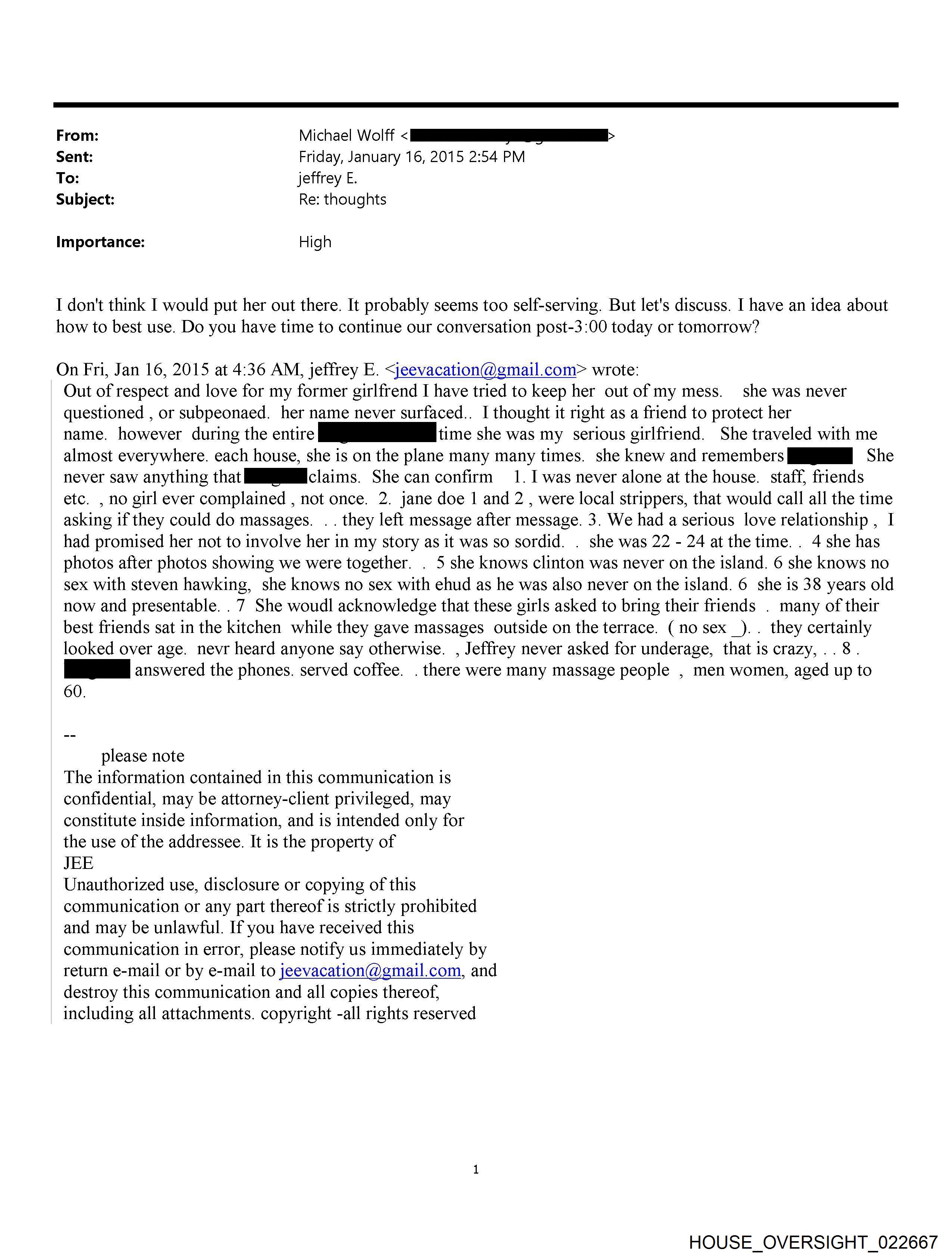 From: Michael Wolff [REDACTED] Sent: Friday, January 16, 2015 2:54 PM To: jeffrey E. Subject: Re: thoughts Importance: High I don't think I would put her out there. It probably seems too self-serving. But let's discuss. I have an idea about how to best use. Do you have time to continue our conversation post-3:00 today or tomorrow? On Fri, Jan 16, 2015 at 4:36 AM, jeffrey E. <jeevacation@gmail.com> wrote: Out of respect and love for my former girlfrend I have tried to keep her out of my mess. she was never questioned, or subpeonaed. her name never surfaced.. I thought it right as a friend to protect her name. however during the entire [REDACTED] time she was my serious girlfriend. She traveled with me almost everywhere, each house, she is on the plane many many times. she knew and remembers [REDACTED] She never saw anything that [REDACTED] claims. She can confirm 1. I was never alone at the house. staff, friends etc. , no girl ever complained, not once. 2. jane doe 1 and 2, were local strippers, that would call all the time asking if they could do massages. . . they left message after message. 3. We had a serious love relationship, I had promised her not to involve her in my story as it was so sordid. . she was 22 - 24 at the time. . 4 she has photos after photos showing we were together. . 5 she knows clinton was never on the island. 6 she knows no sex with steven hawking, she knows no sex with ehud as he was also never on the island. 6 she is 38 years old now and presentable. . 7 She woudl acknowledge that these girls asked to bring their friends . many of their best friends sat in the kitchen while they gave massages outside on the terrace. ( no sex _). . they certainly looked over age. nevr heard anyone say otherwise. , Jeffrey never asked for underage, that is crazy, . . 8 . [REDACTED] answered the phones. served coffee. . there were many massage people , men women, aged up to 60. please note The information contained in this communication is confidential, may be attorney-client privileged, may constitute inside information, and is intended only for the use of the addressee. It is the property of JEE Unauthorized use, disclosure or copying of this communication or any part thereof is strictly prohibited and may be unlawful. If you have received this communication in error, please notify us immediately by return e-mail or by e-mail to jeevacation@gmail.com, and destroy this communication and all copies thereof, including all attachments. copyright -all rights reserved HOUSE OVERSIGHT 022667