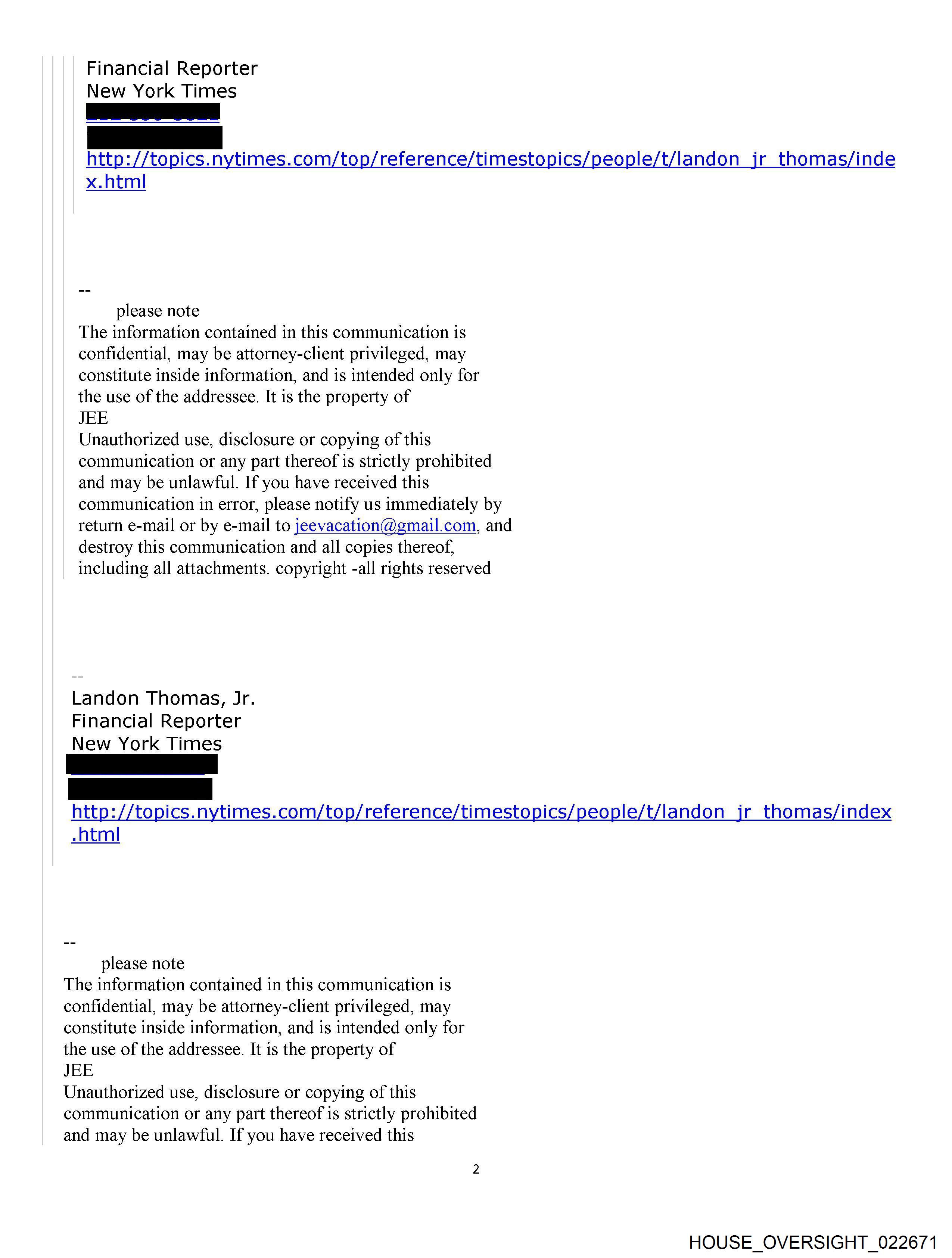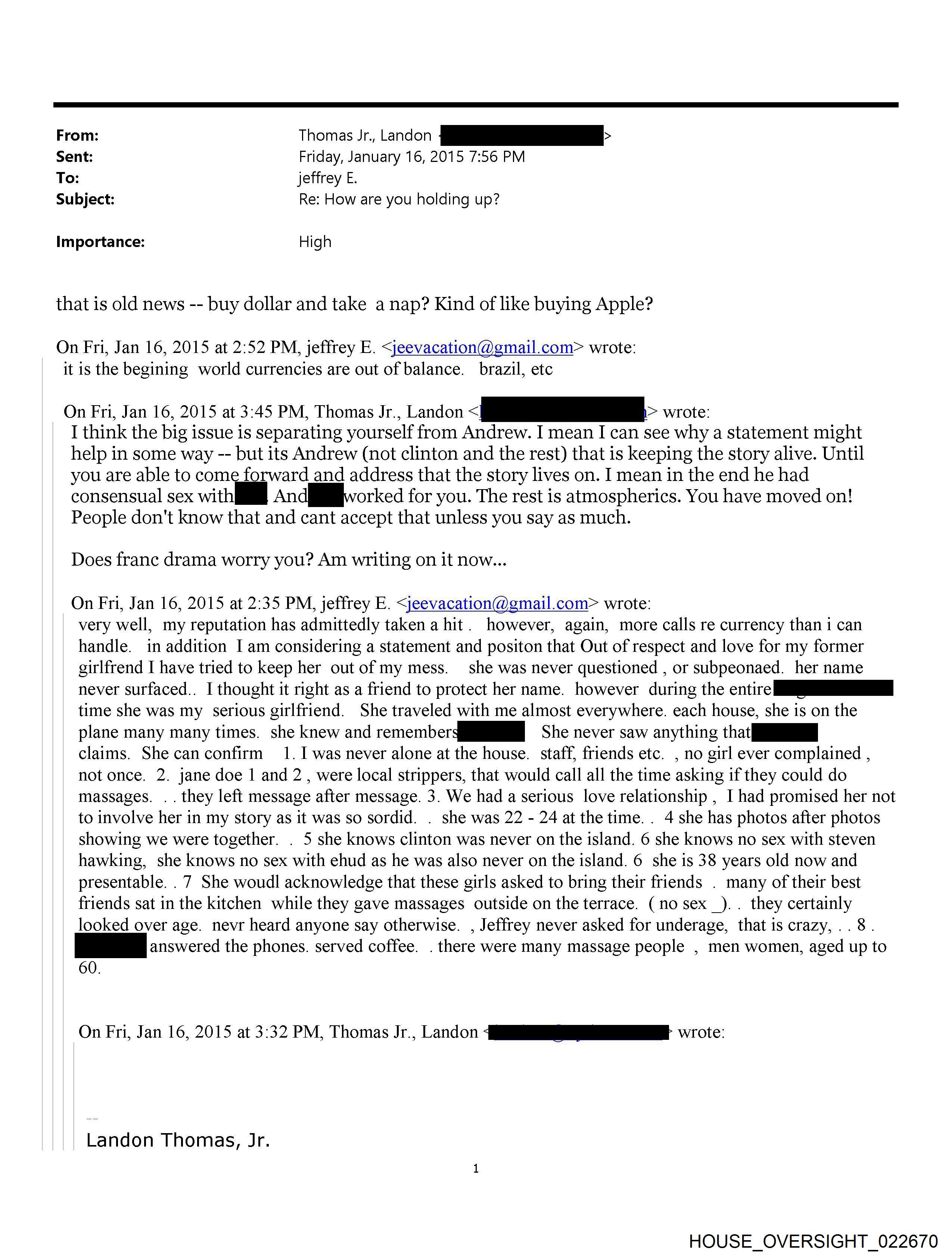 From: Thomas Jr., Landon [REDACTED] Sent: Friday, January 16, 2015 7:56 PM To: jeffrey E. Subject: Re: How are you holding up? Importance: High that is old news -- buy dollar and take a nap? Kind of like buying Apple? On Fri, Jan 16, 2015 at 2:52 PM, jeffrey E. <jeevacation@gmail.com> wrote: it is the begining world currencies are out of balance. brazil, etc On Fri, Jan 16, 2015 at 3:45 PM, Thomas Jr., Landon <[REDACTED]> wrote: I think the big issue is separating yourself from Andrew. I mean I can see why a statement might help in some way -- but its Andrew (not clinton and the rest) that is keeping the story alive. Until you are able to come forward and address that the story lives on. I mean in the end he had consensual sex with [REDACTED] And [REDACTED] worked for you. The rest is atmospherics. You have moved on! People don't know that and cant accept that unless you say as much. Does franc drama worry you? Am writing on it now... On Fri, Jan 16, 2015 at 2:35 PM, jeffrey E. <jeevacation@gmail.com> wrote: very well, my reputation has admittedly taken a hit. however, again, more calls re currency than i can handle. in addition I am considering a statement and positon that Out of respect and love for my former girlfrend I have tried to keep her out of my mess. she was never questioned, or subpeonaed. her name never surfaced.. I thought it right as a friend to protect her name. however during the entire [REDACTED] time she was my serious girlfriend. She traveled with me almost everywhere, each house, she is on the plane many many times. she knew and remember [REDACTED] She never saw anything that [REDACTED] claims. She can confirm 1. I was never alone at the house. staff, friends etc. , no girl ever complained, not once. 2. jane doe 1 and 2, were local strippers, that would call all the time asking if they could do massages . . . they left message after message. 3. We had a serious love relationship, I had promised her not to involve her in my story as it was so sordid. . she was 22 - 24 at the time. . 4 she has photos after photos showing we were together. . 5 she knows clinton was never on the island. 6 she knows no sex with steven hawking, she knows no sex with ehud as he was also never on the island. 6 she is 38 years old now and presentable. . 7 She woudl acknowledge that these girls asked to bring their friends . many of their best friends sat in the kitchen while they gave massages outside on the terrace. ( no sex _) . they certainly looked over age. nevr heard anyone say otherwise. , Jeffrey never asked for underage, that is crazy, . . 8. [REDACTED] answered the phones. served coffee. . there were many massage people , men women, aged up to 60. On Fri, Jan 16, 2015 at 3:32 PM, Thomas Jr., Landon <[REDACTED]> Landon Thomas, Jr. Financial Reporter New York Times [REDACTED] [REDACTED] http://topics.nytimes.conn/top/reference/timestopics/people/t/landon jr_thomas/index.html please note The information contained in this communication is confidential, may be attorney-client privileged, may constitute inside information, and is intended only for the use of the addressee. It is the property of JEE Unauthorized use, disclosure or copying of this communication or any part thereof is strictly prohibited and may be unlawful. If you have received this communication in error, please notify us immediately by return e-mail or by e-mail to jeevacation@gmail.com, and destroy this communication and all copies thereof, including all attachments. copyright -all rights reserved HOUSE OVERSIGHT 022670 HOUSE OVERSIGHT 022671 HOUSE OVERSIGHT 022672